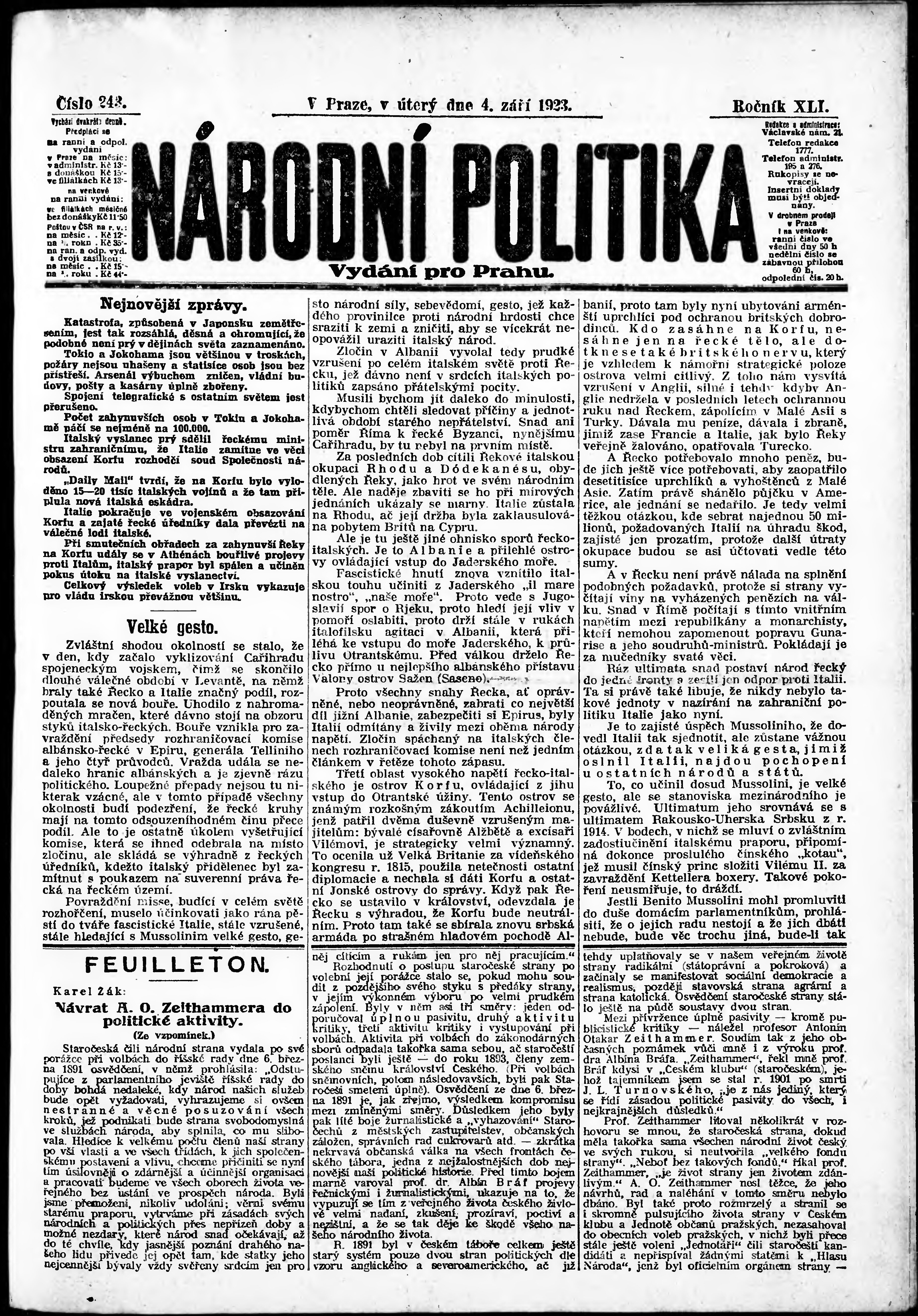 * Datum vydání výtisku: 4.9.1923 Číslo výtisku: 243 Poznámky k výtisku: ranní vydání; vydání pro Prahu;