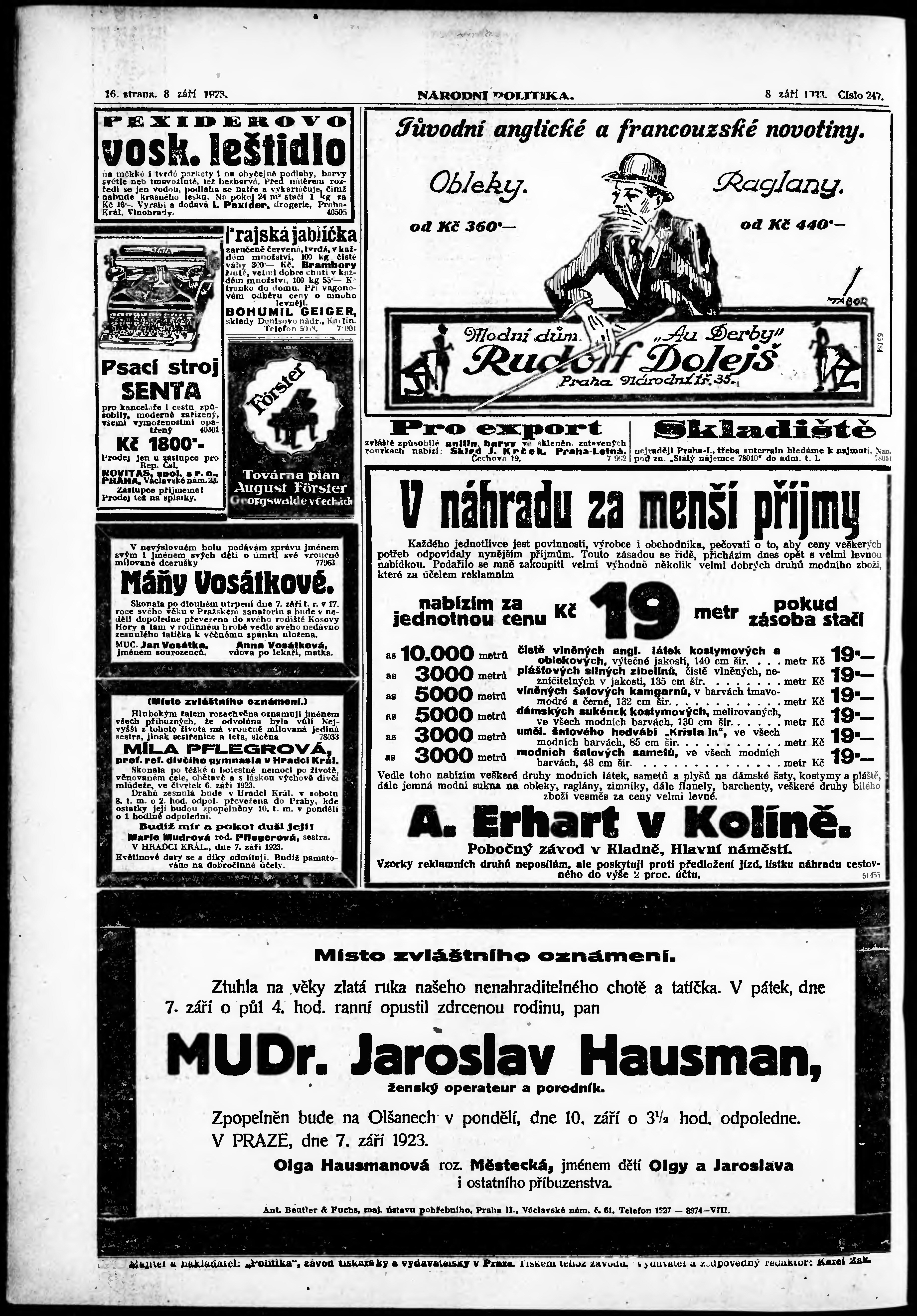 * Datum vydání výtisku: 8.9.1923 Číslo výtisku: 247 Poznámky k výtisku: ranní vydání;