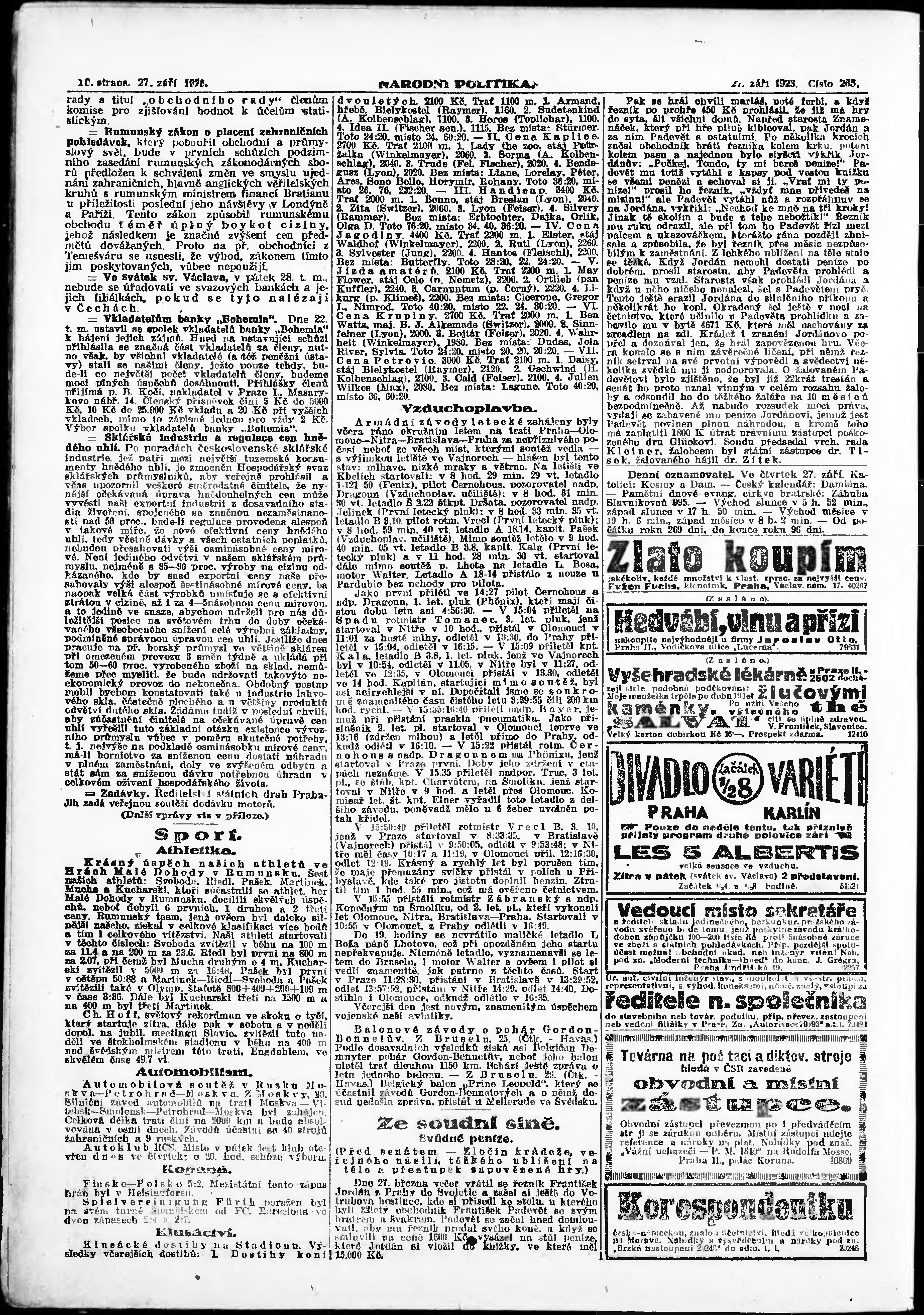 * Datum vydání výtisku: 27.9.1923 Číslo výtisku: 265 Poznámky k výtisku: ranní vydání; vydání pro Prahu;
