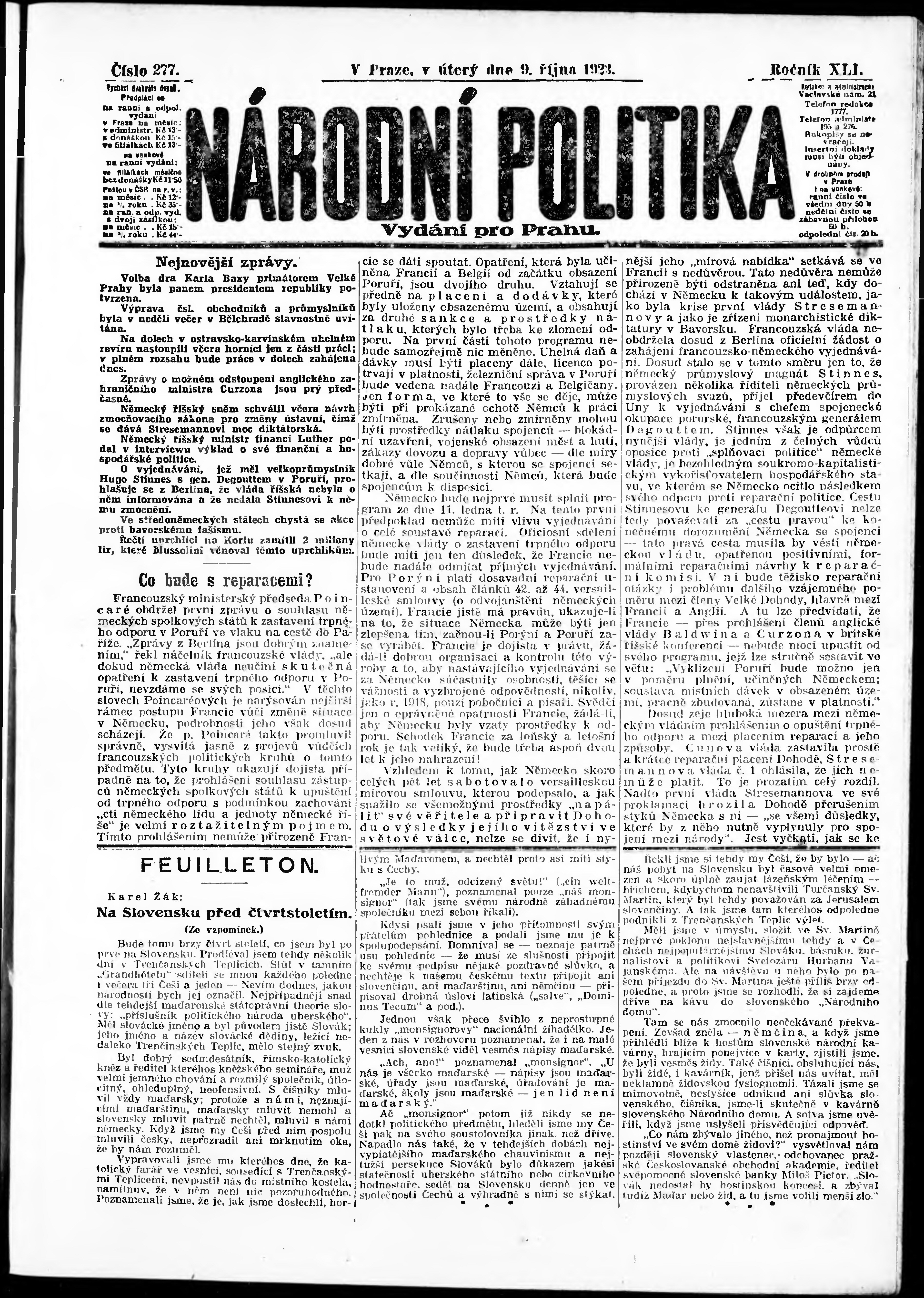* Datum vydání výtisku: 9.10.1923 Číslo výtisku: 277 Poznámky k výtisku: ranní vydání; vydání pro Prahu;