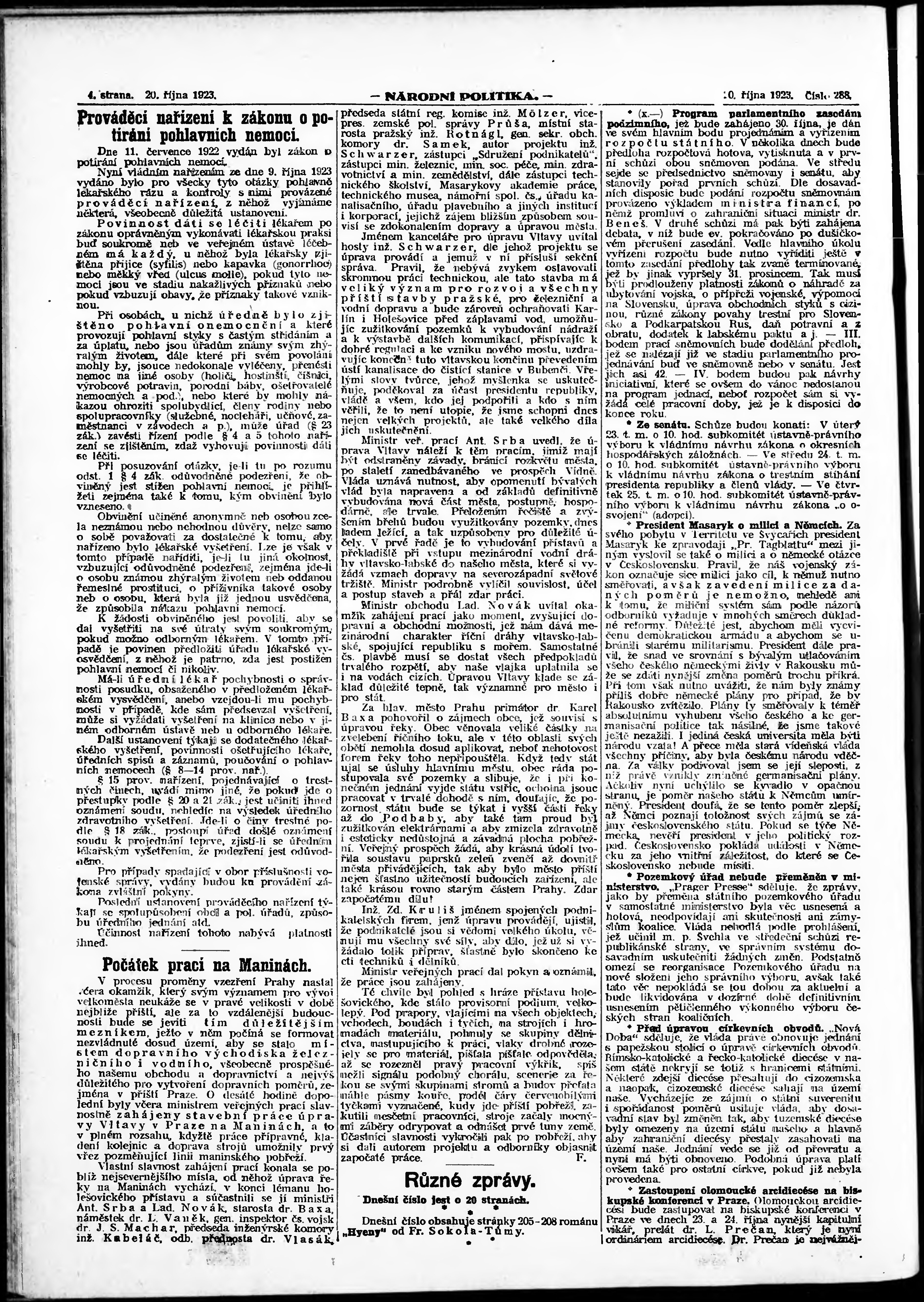 * Datum vydání výtisku: 20.10.1923 Číslo výtisku: 288 Poznámky k výtisku: ranní vydání; vydání pro Prahu;