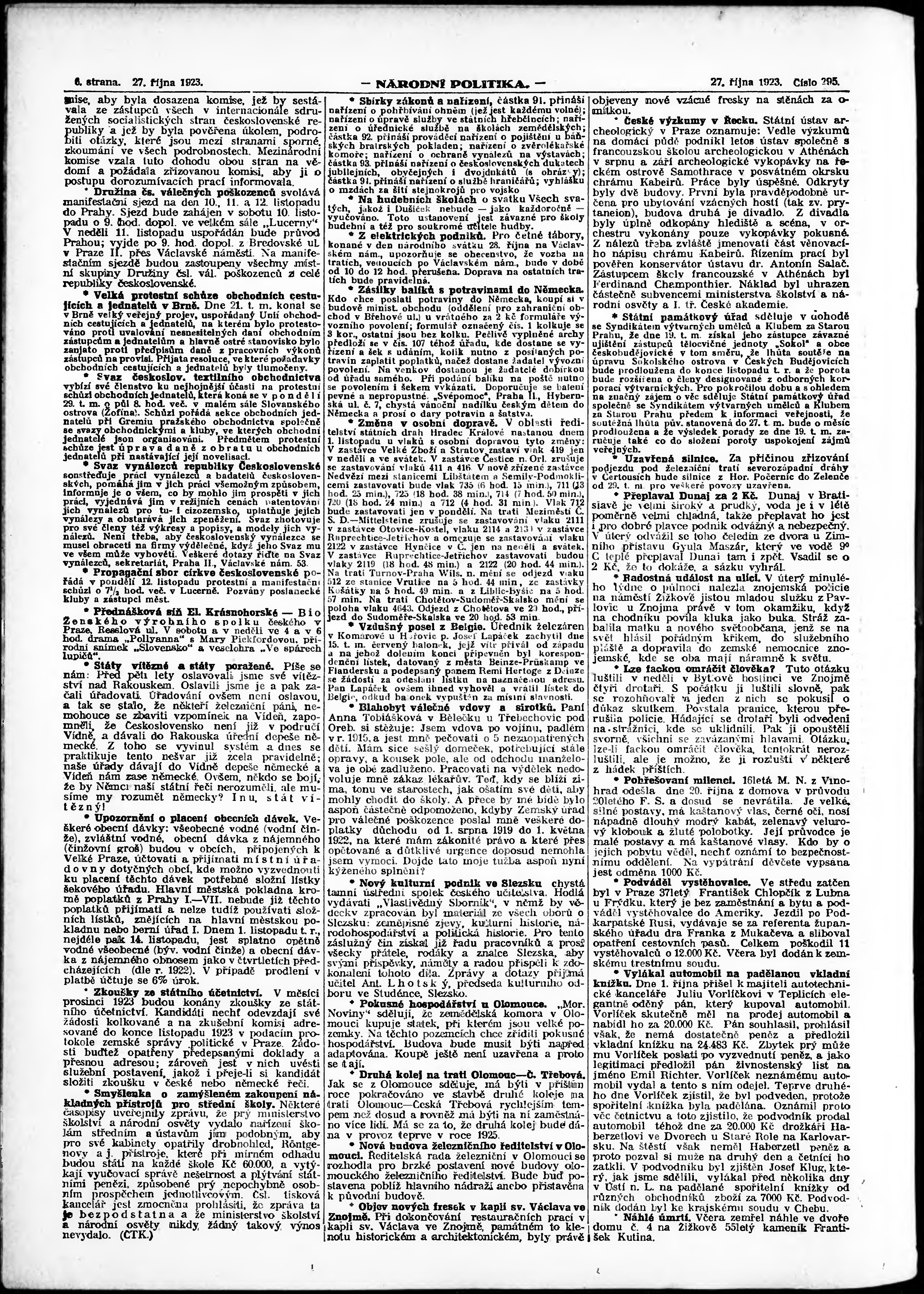 * Datum vydání výtisku: 27.10.1923 Číslo výtisku: 295 Poznámky k výtisku: ranní vydání; vydání pro Prahu;