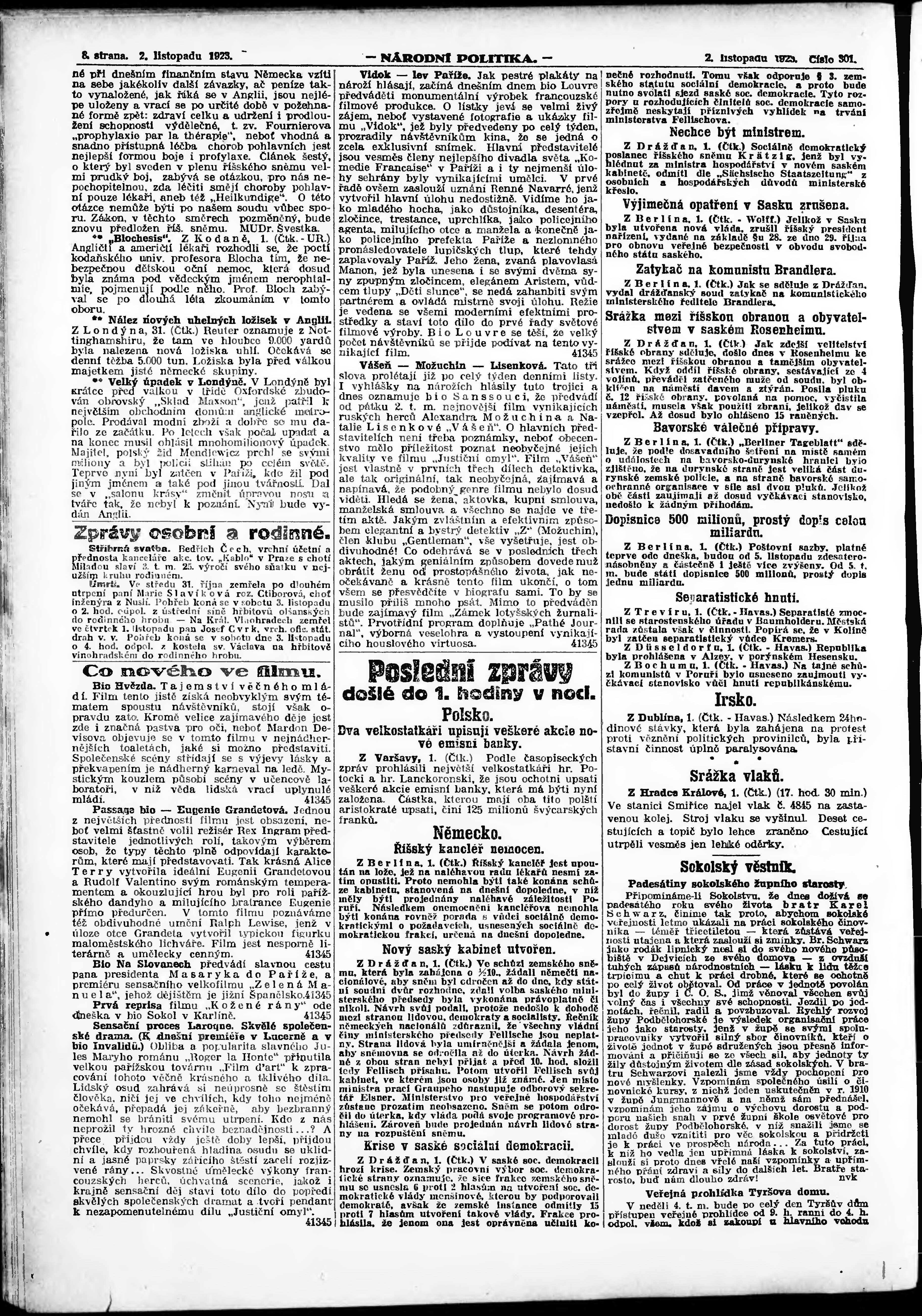 * Datum vydání výtisku: 2.11.1923 Číslo výtisku: 301 Poznámky k výtisku: ranní vydání; vydání pro Prahu;