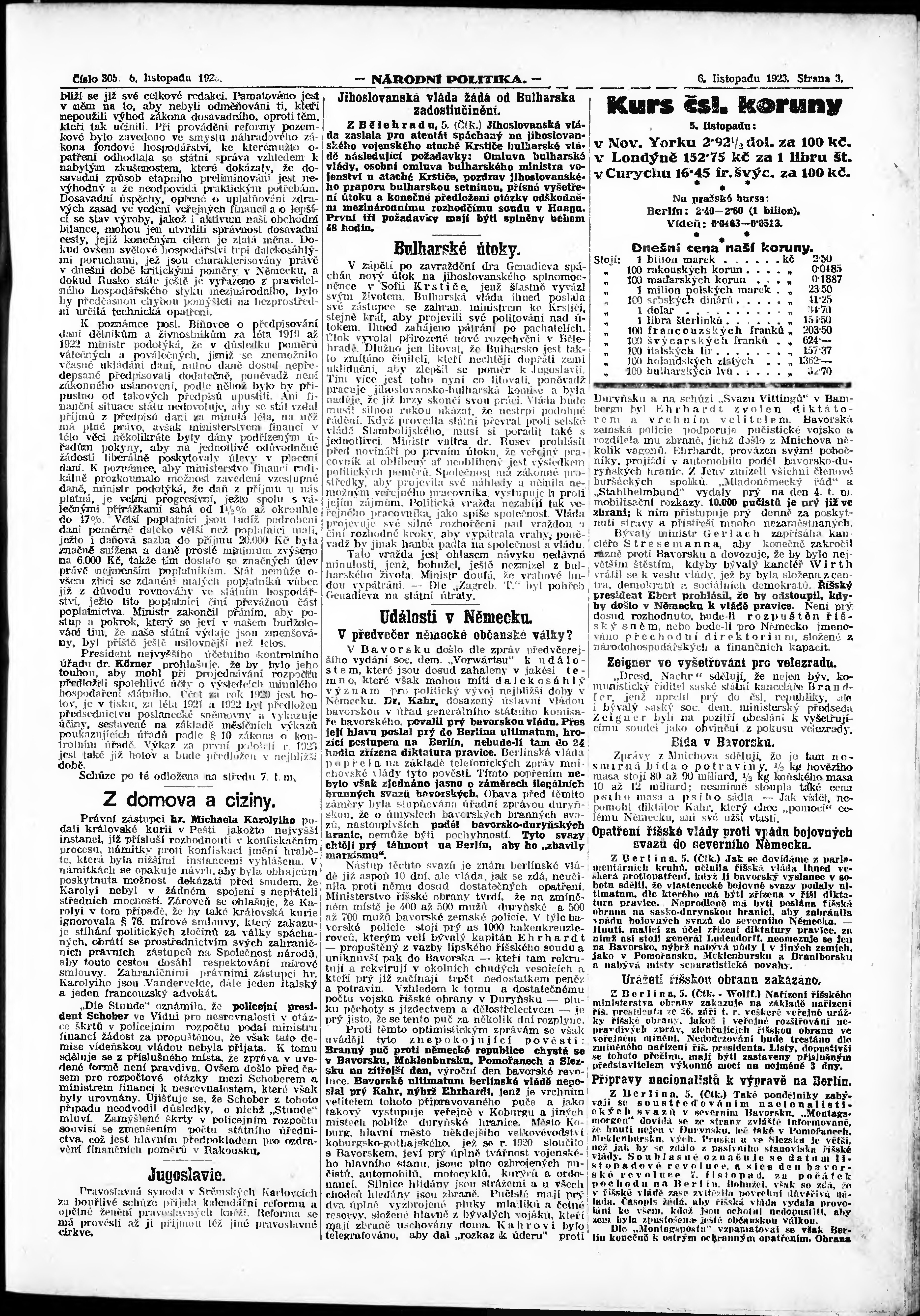 * Datum vydání výtisku: 6.11.1923 Číslo výtisku: 305 Poznámky k výtisku: ranní vydání; vydání pro Prahu;