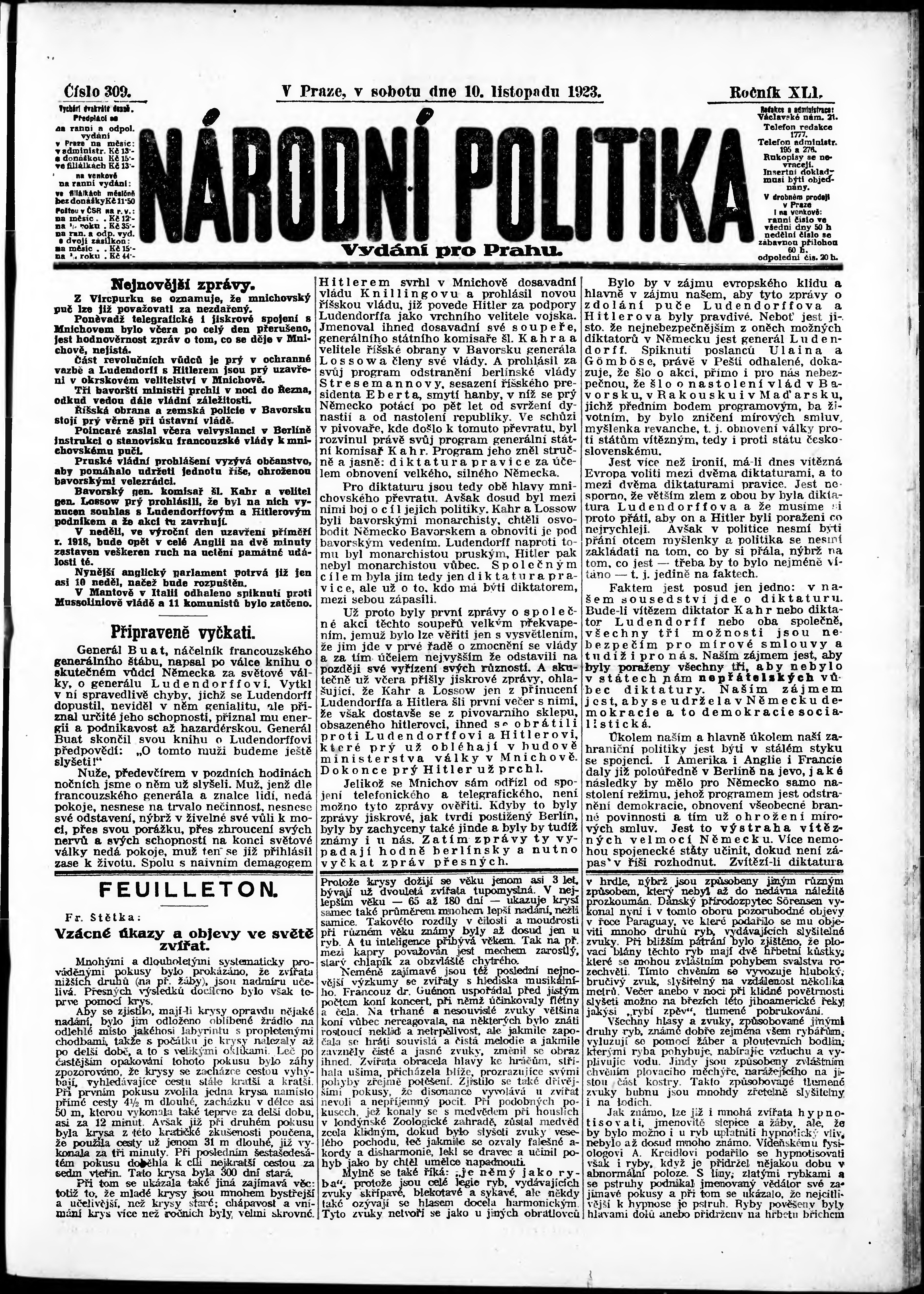 * Datum vydání výtisku: 10.11.1923 Číslo výtisku: 309 Poznámky k výtisku: ranní vydání; vydání pro Prahu;