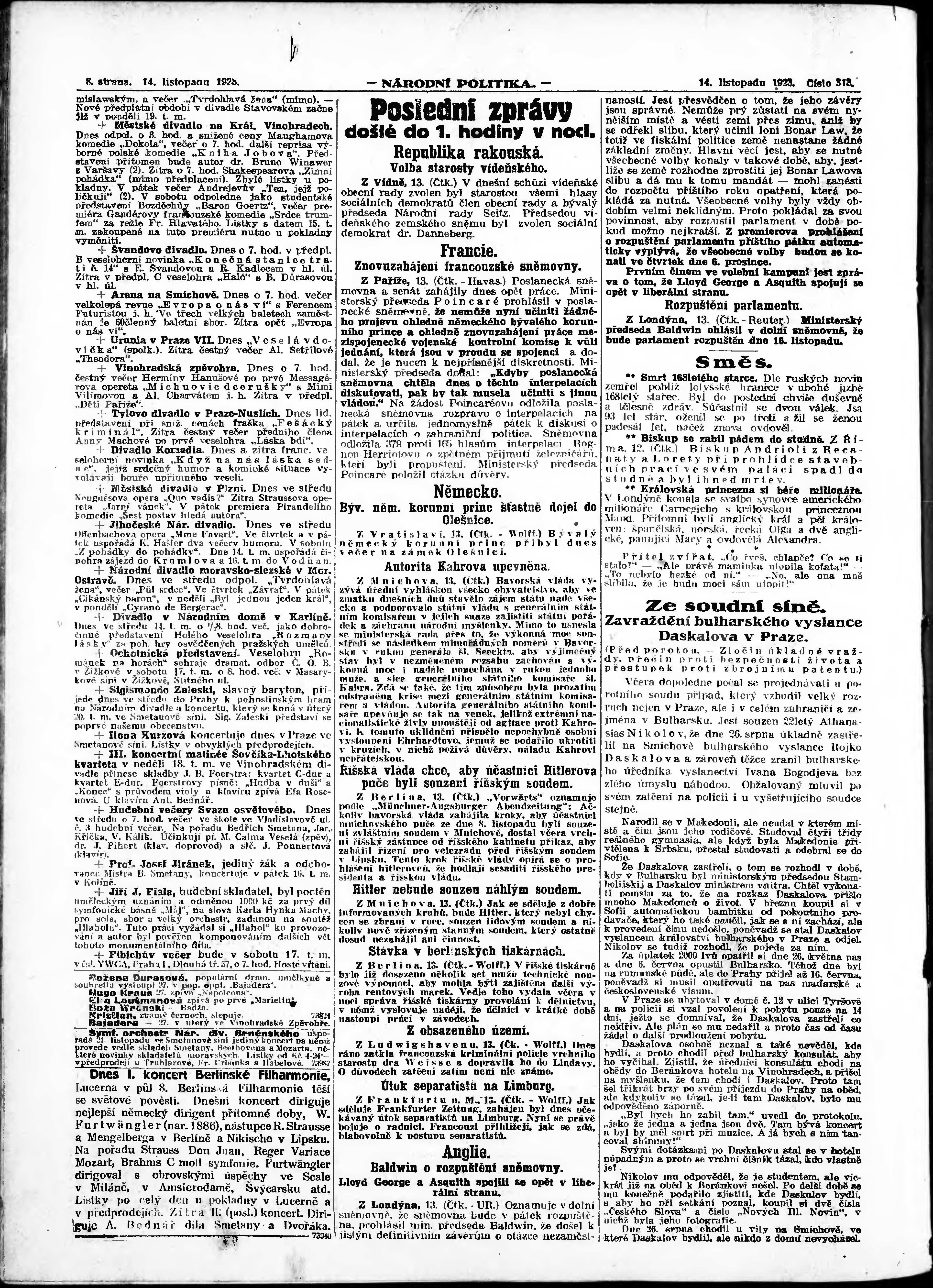 * Datum vydání výtisku: 14.11.1923 Číslo výtisku: 313 Poznámky k výtisku: ranní vydání; vydání pro Prahu;