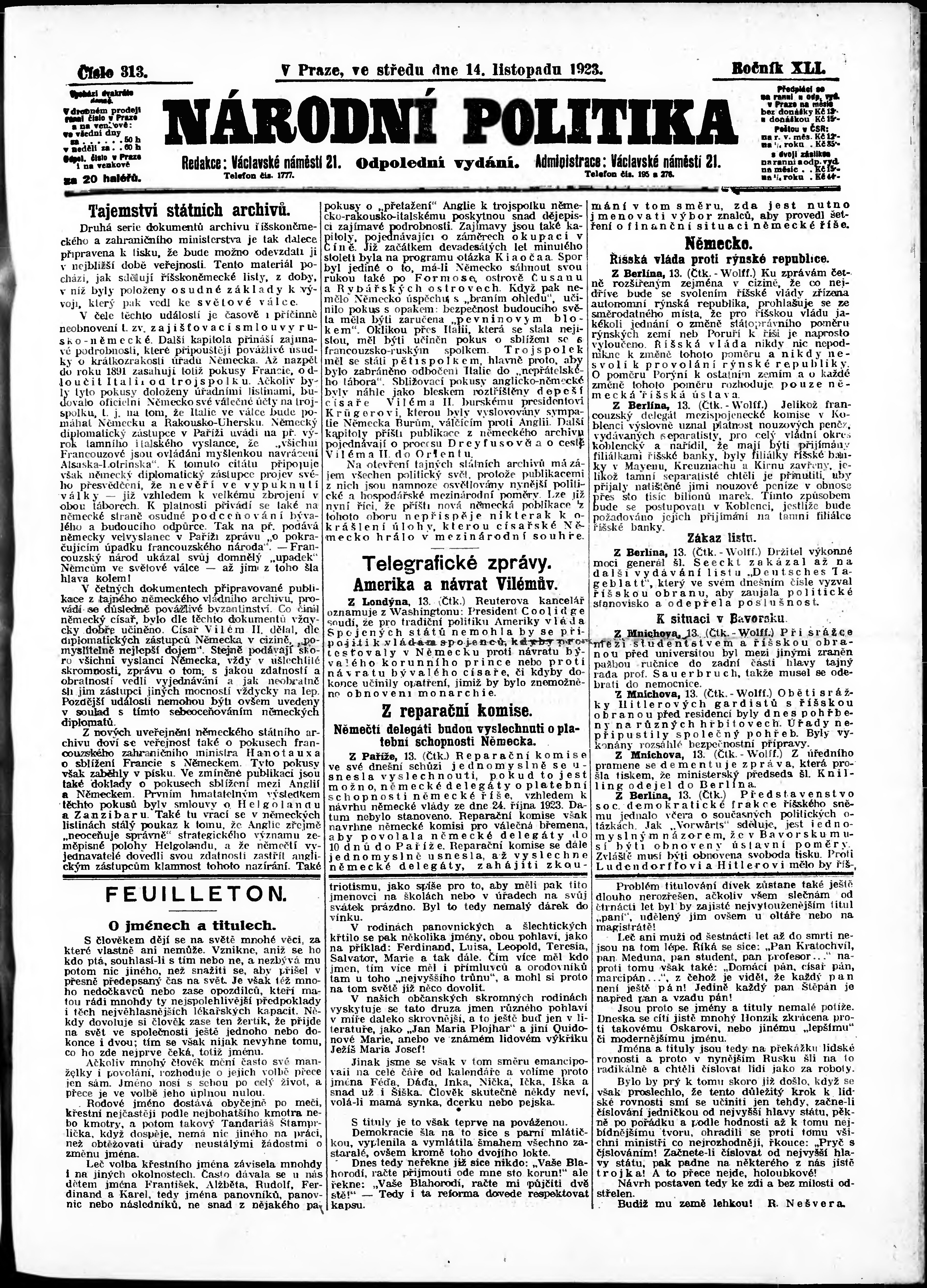 * Datum vydání výtisku: 14.11.1923 Číslo výtisku: 313 Poznámky k výtisku: odpolední vydání;