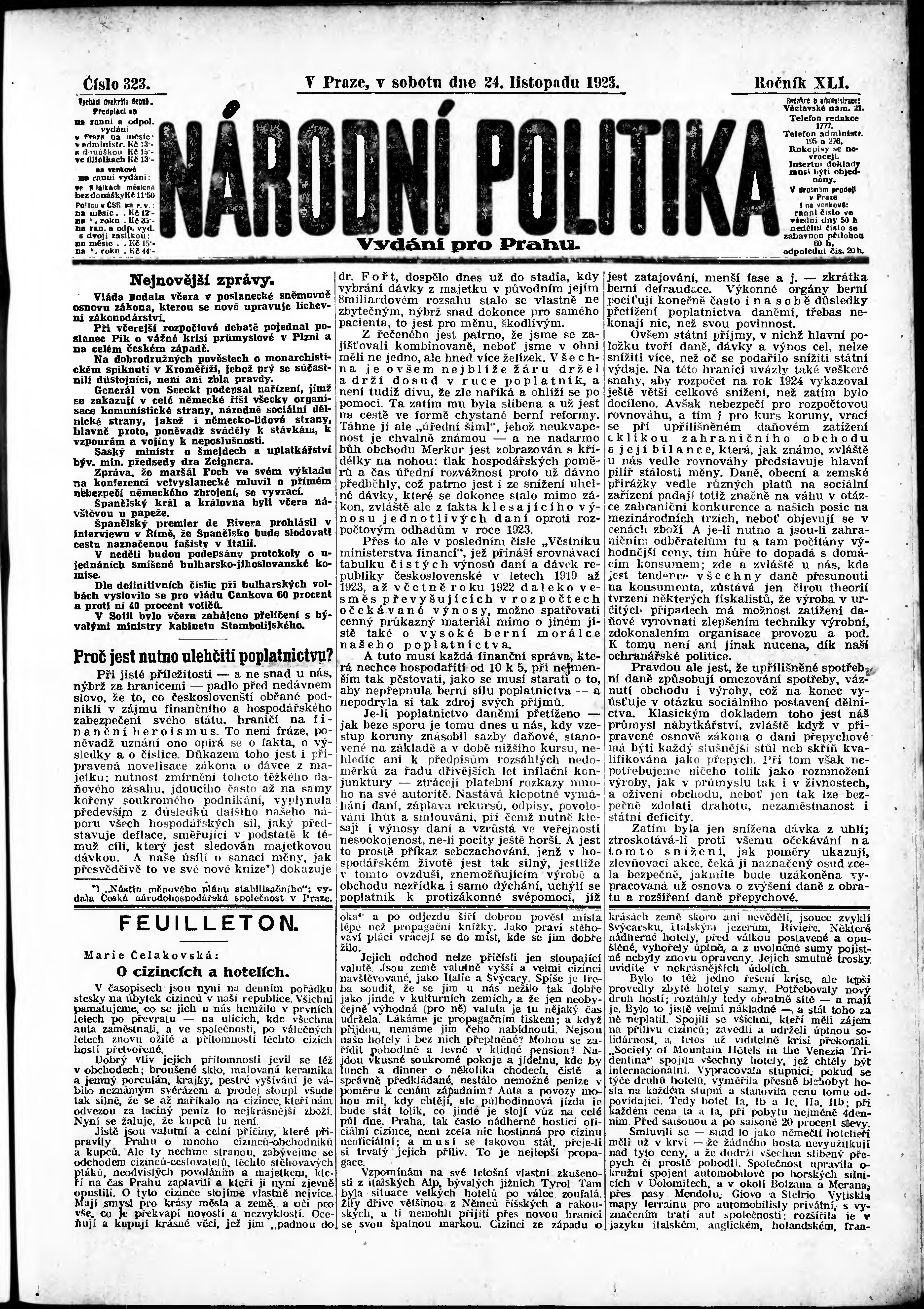 * Datum vydání výtisku: 24.11.1923 Číslo výtisku: 323 Poznámky k výtisku: ranní vydání; vydání pro Prahu;