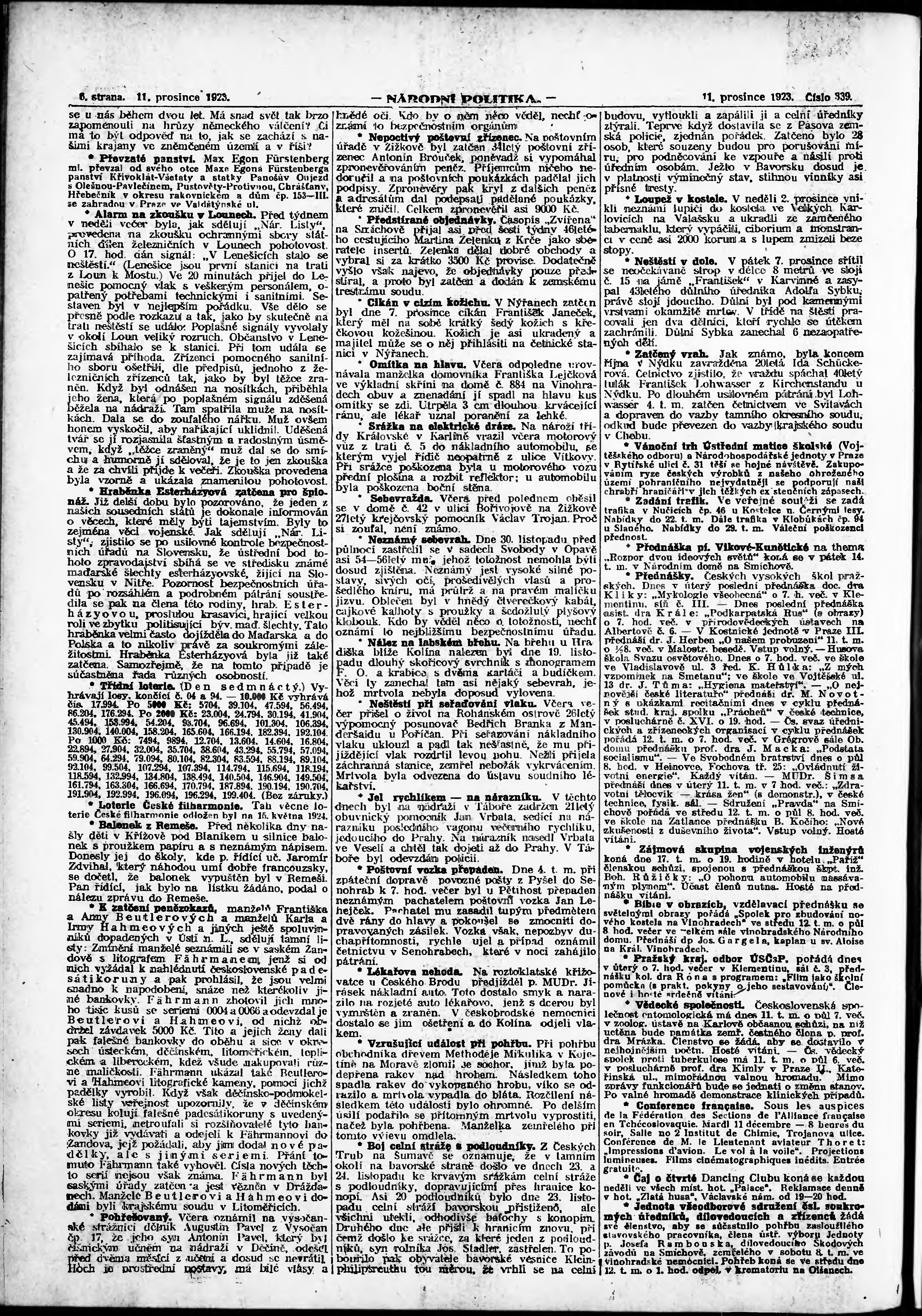 * Datum vydání výtisku: 11.12.1923 Číslo výtisku: 339 Poznámky k výtisku: ranní vydání; vydání pro Prahu;