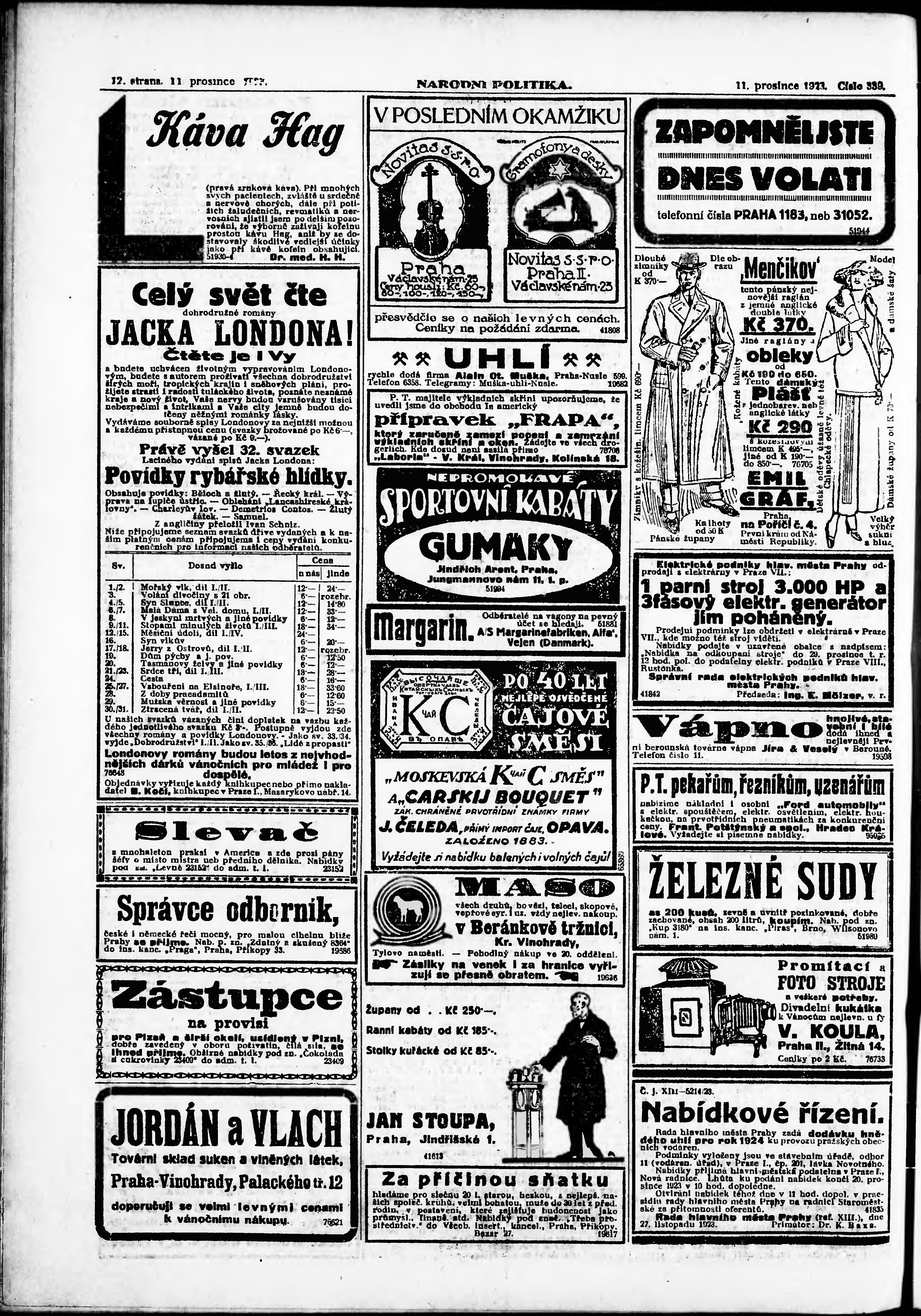 * Datum vydání výtisku: 11.12.1923 Číslo výtisku: 339 Poznámky k výtisku: ranní vydání; vydání pro Prahu;