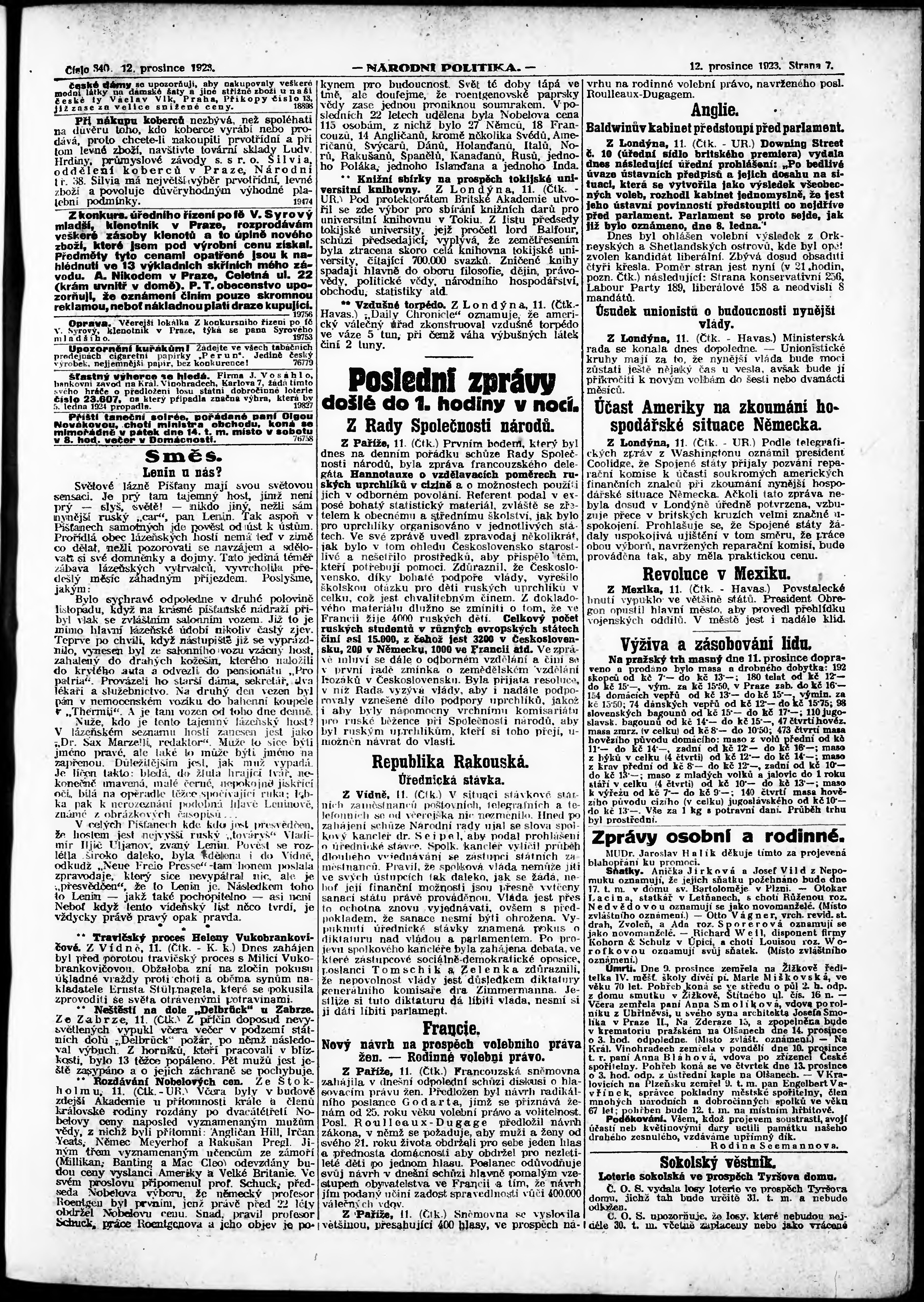 * Datum vydání výtisku: 12.12.1923 Číslo výtisku: 340 Poznámky k výtisku: ranní vydání; vydání pro Prahu;