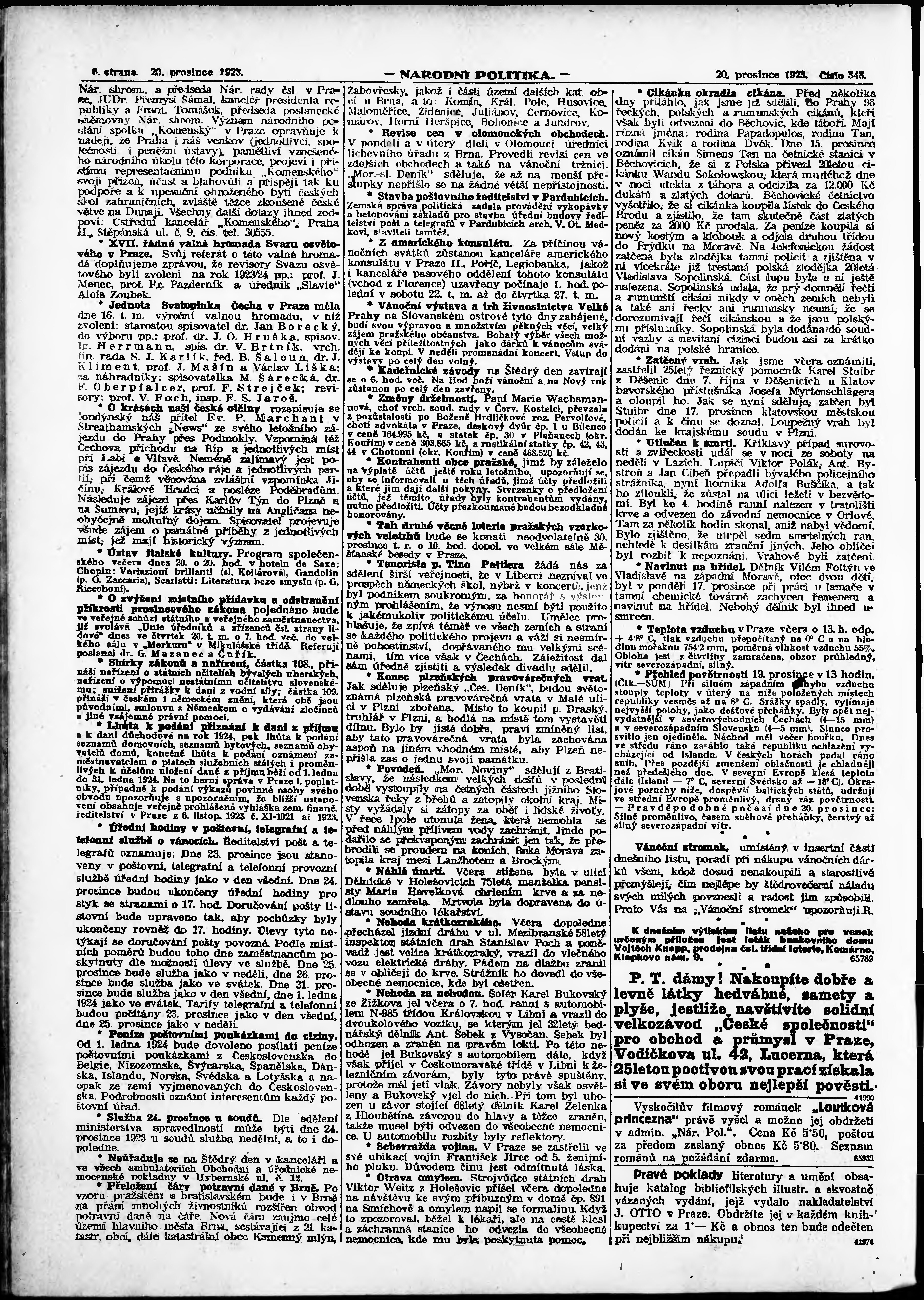 * Datum vydání výtisku: 20.12.1923 Číslo výtisku: 348 Poznámky k výtisku: ranní vydání; vydání pro Prahu;