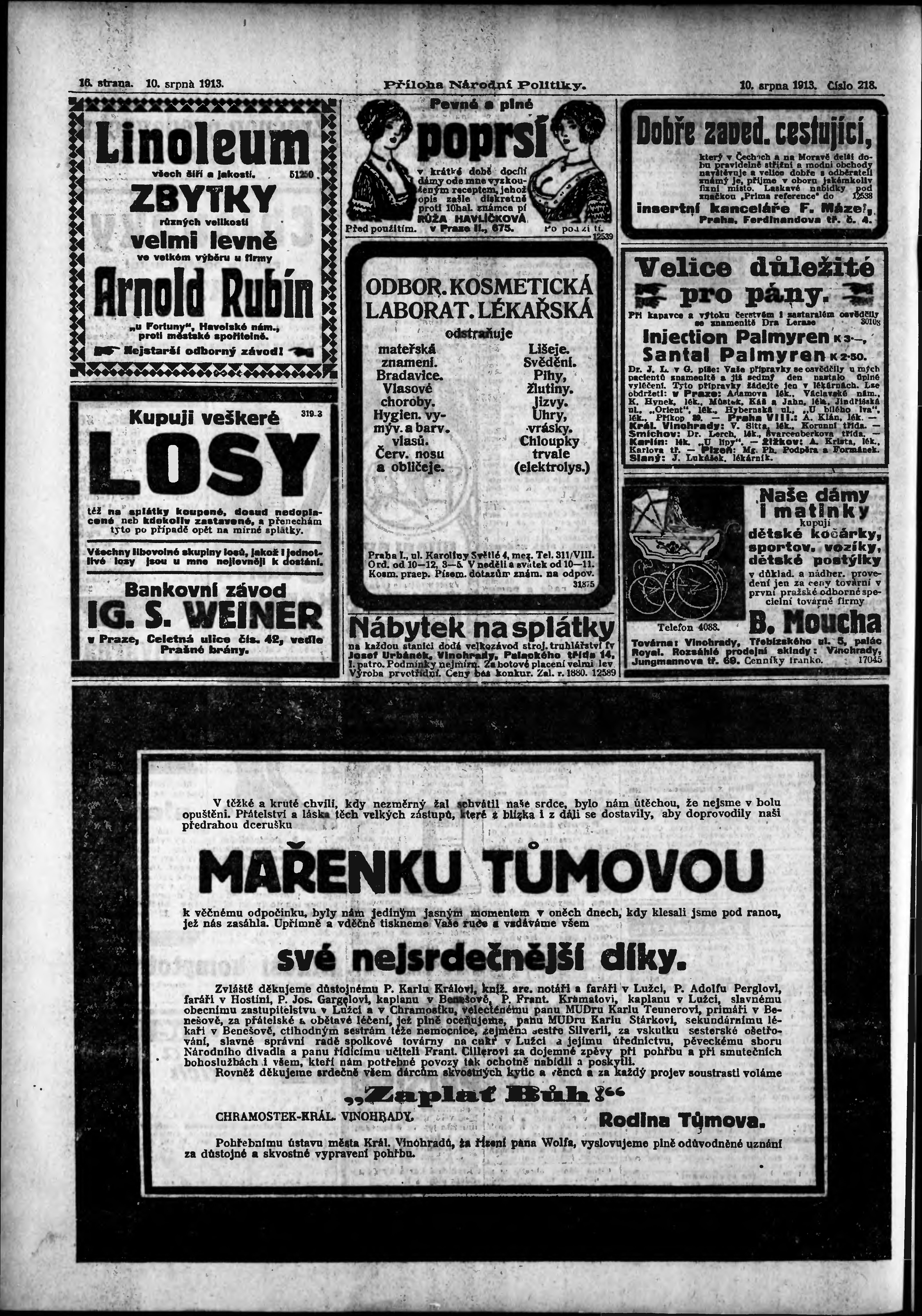 * Datum vydání výtisku: 10.8.1913 Číslo výtisku: 218 Typ výtisku: příloha