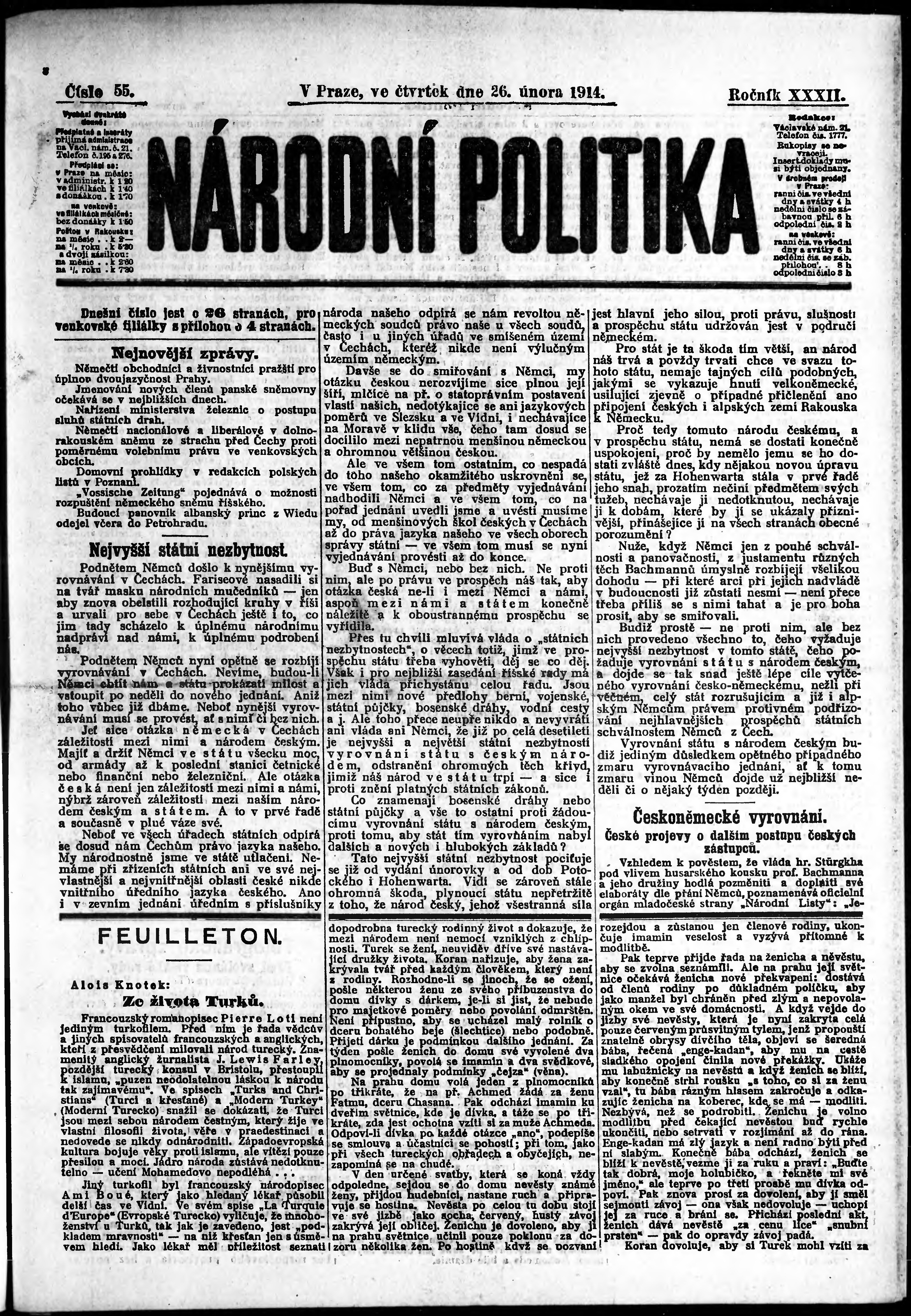 * Datum vydání výtisku: 26.2.1914 Číslo výtisku: 55 Poznámky k výtisku: ranní vydání;