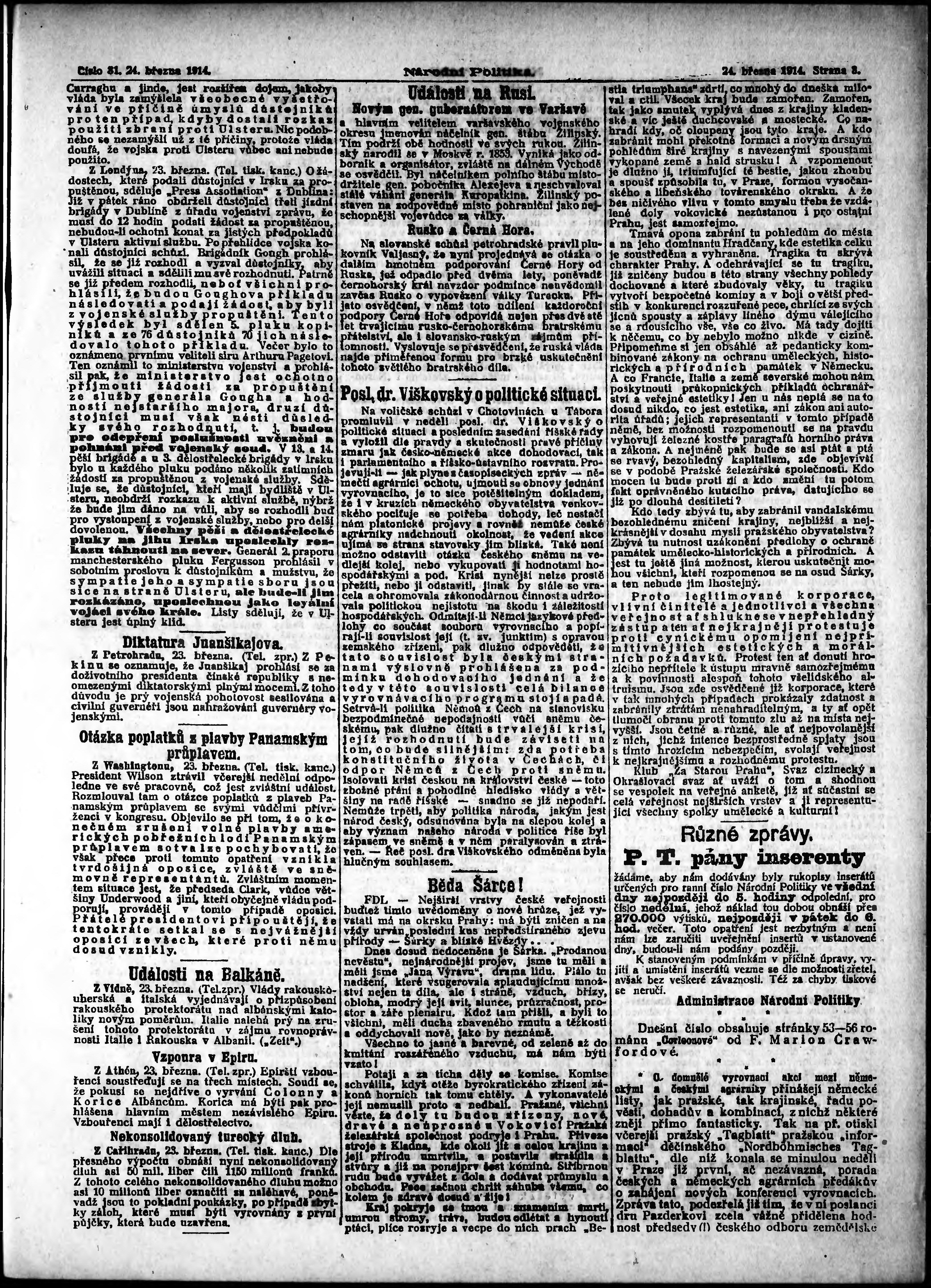 * Datum vydání výtisku: 24.3.1914 Číslo výtisku: 81 Poznámky k výtisku: ranní vydání; s. 11 - 12 není k dispozici;