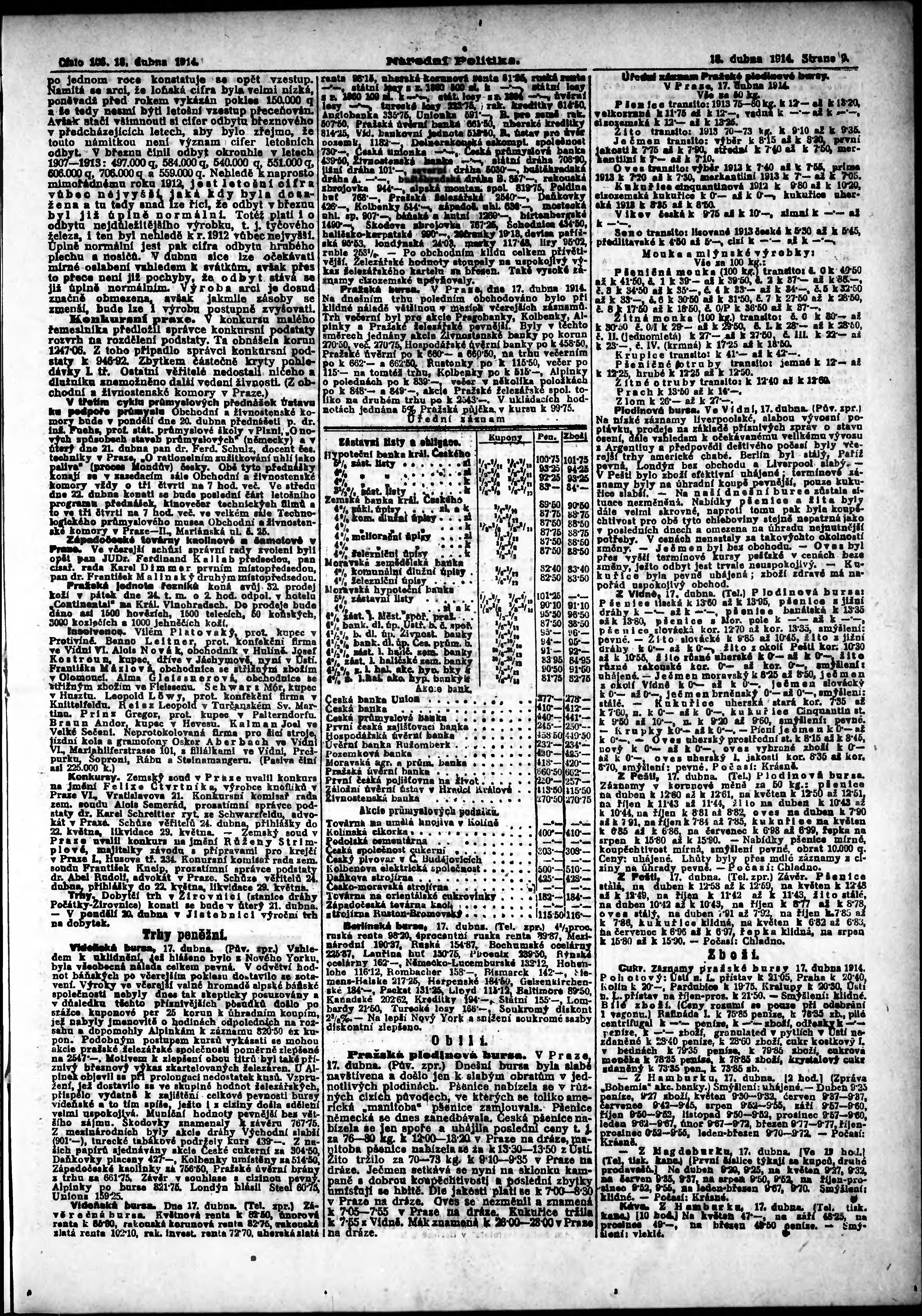 * Datum vydání výtisku: 18.4.1914 Číslo výtisku: 105 Poznámky k výtisku: ranní vydání; s. 11 - 12 není k dispozici;