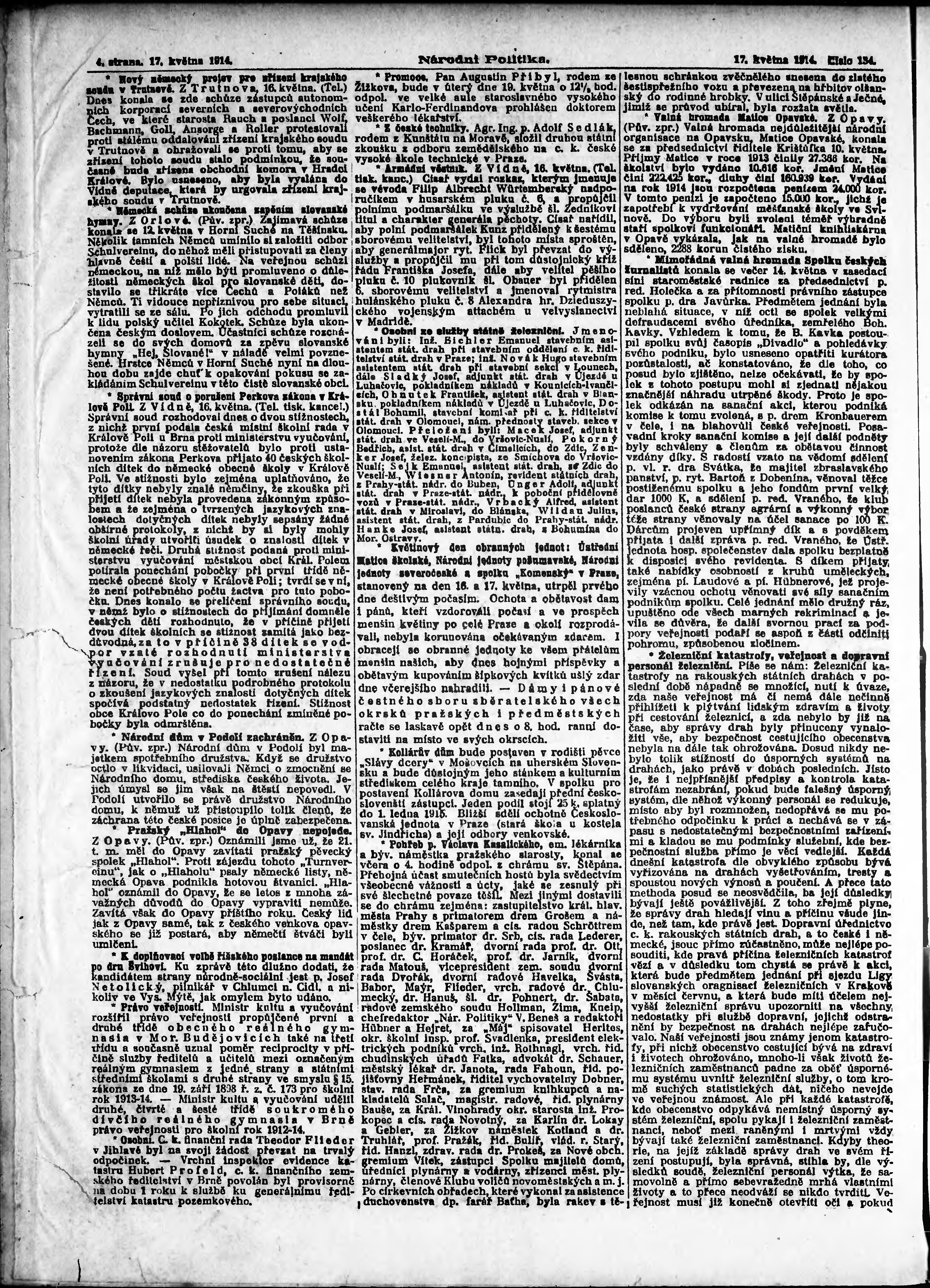 * Datum vydání výtisku: 17.5.1914 Číslo výtisku: 134 Poznámky k výtisku: ranní vydání;