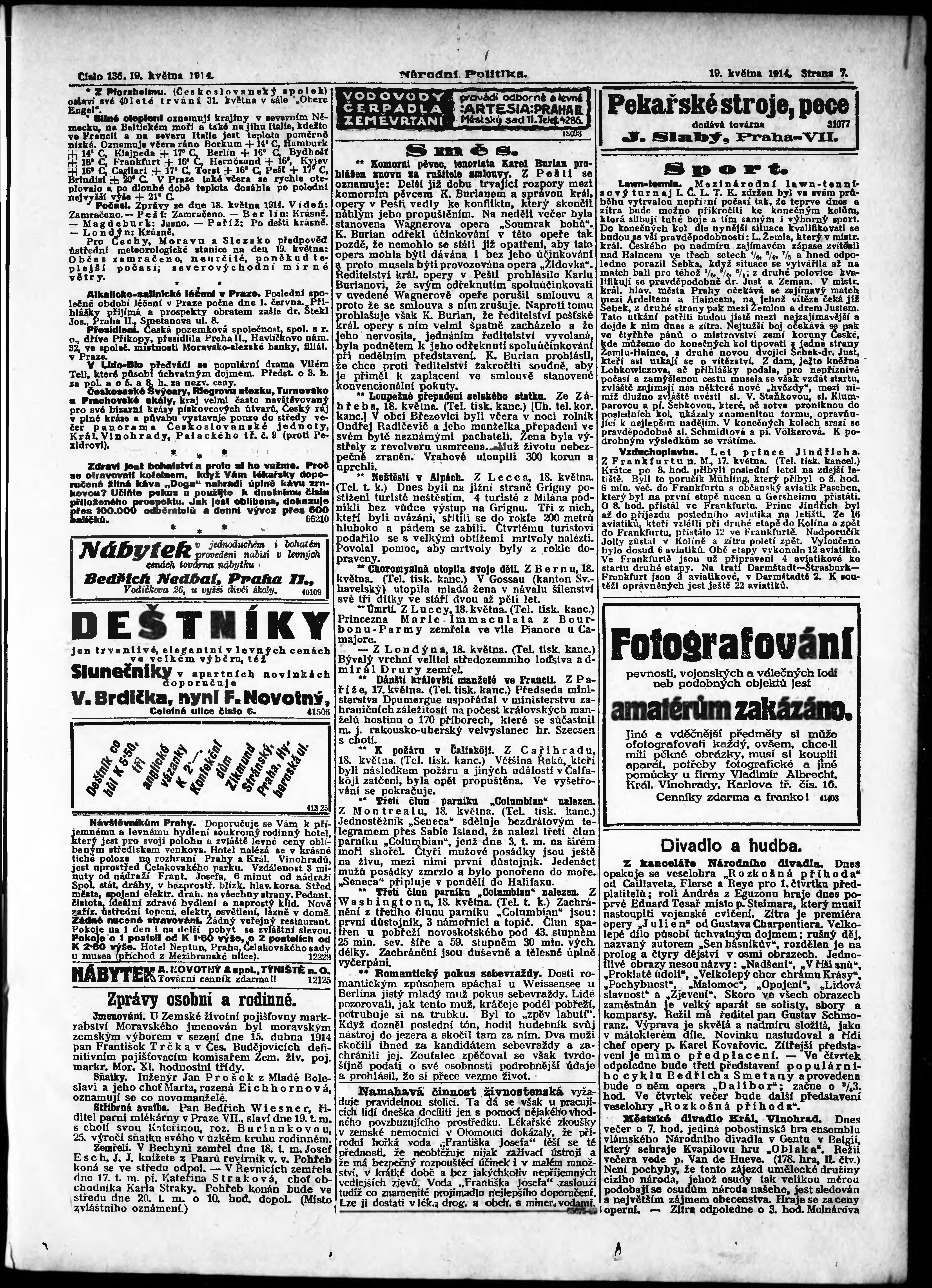 * Datum vydání výtisku: 19.5.1914 Číslo výtisku: 136 Poznámky k výtisku: ranní vydání; s. 9 - 10 není k dispozici;