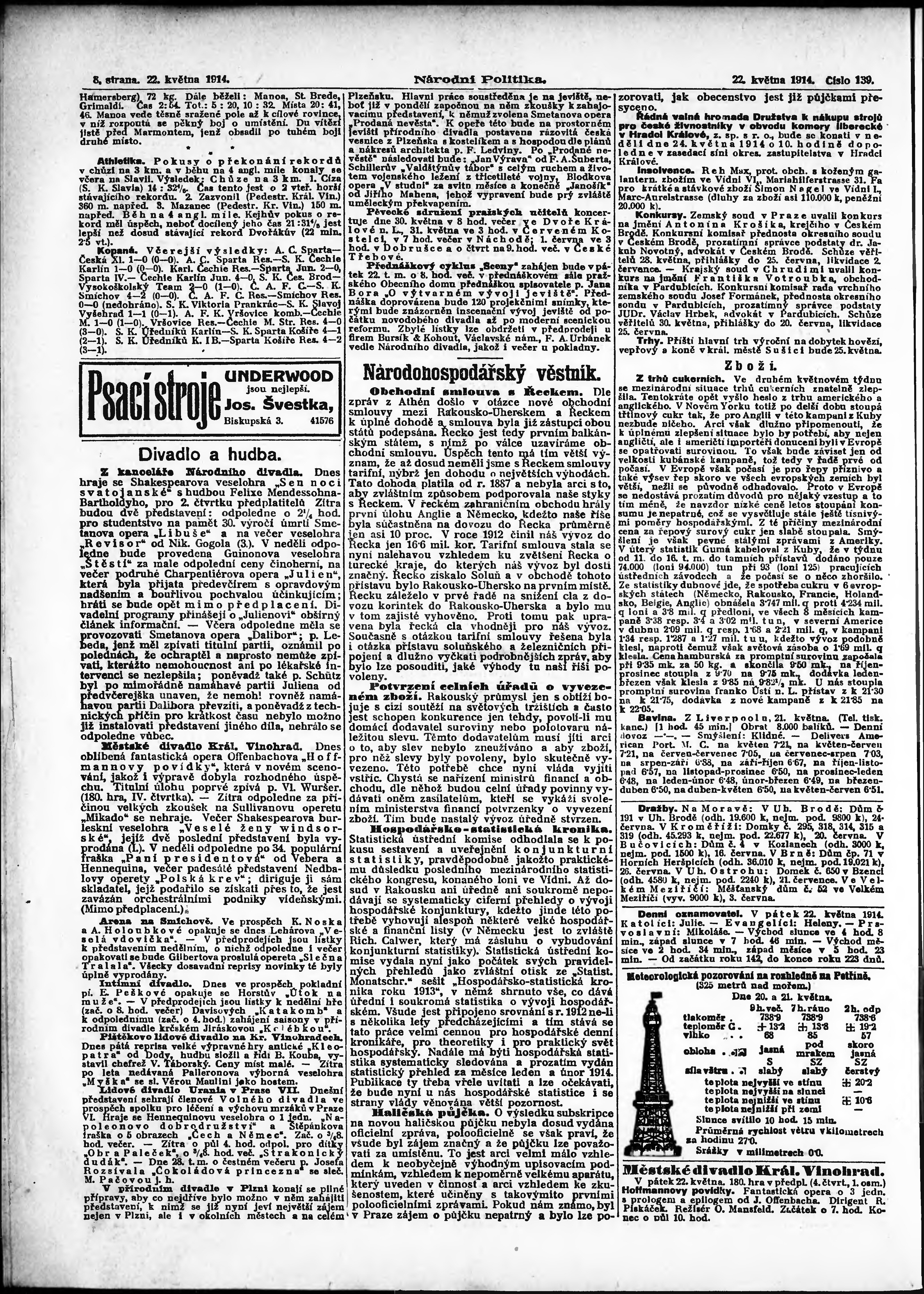 * Datum vydání výtisku: 22.5.1914 Číslo výtisku: 139 Poznámky k výtisku: ranní vydání; s. 9 - 10 není k dispozici;