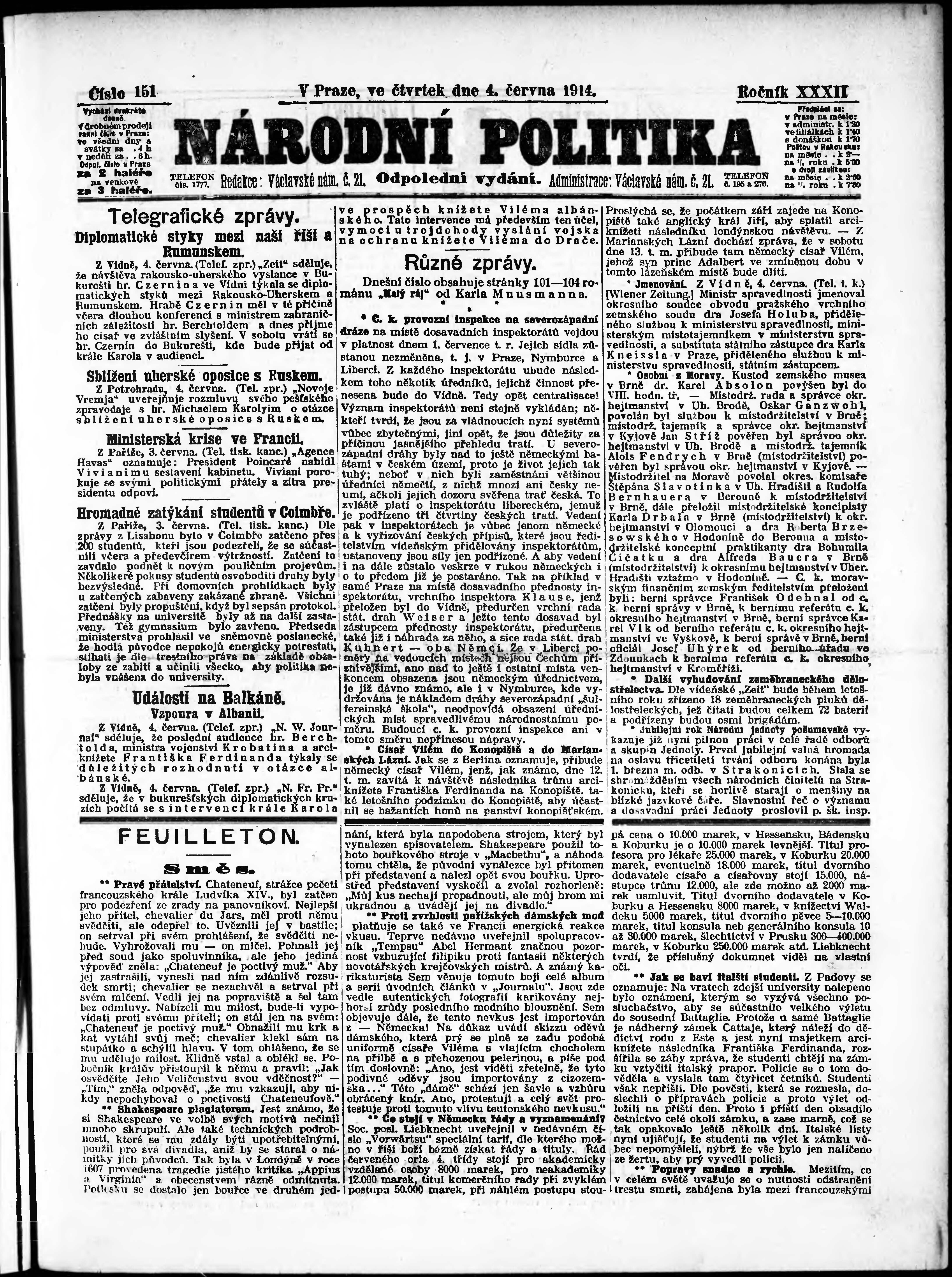 * Datum vydání výtisku: 4.6.1914 Číslo výtisku: 151 Poznámky k výtisku: odpolední vydání;