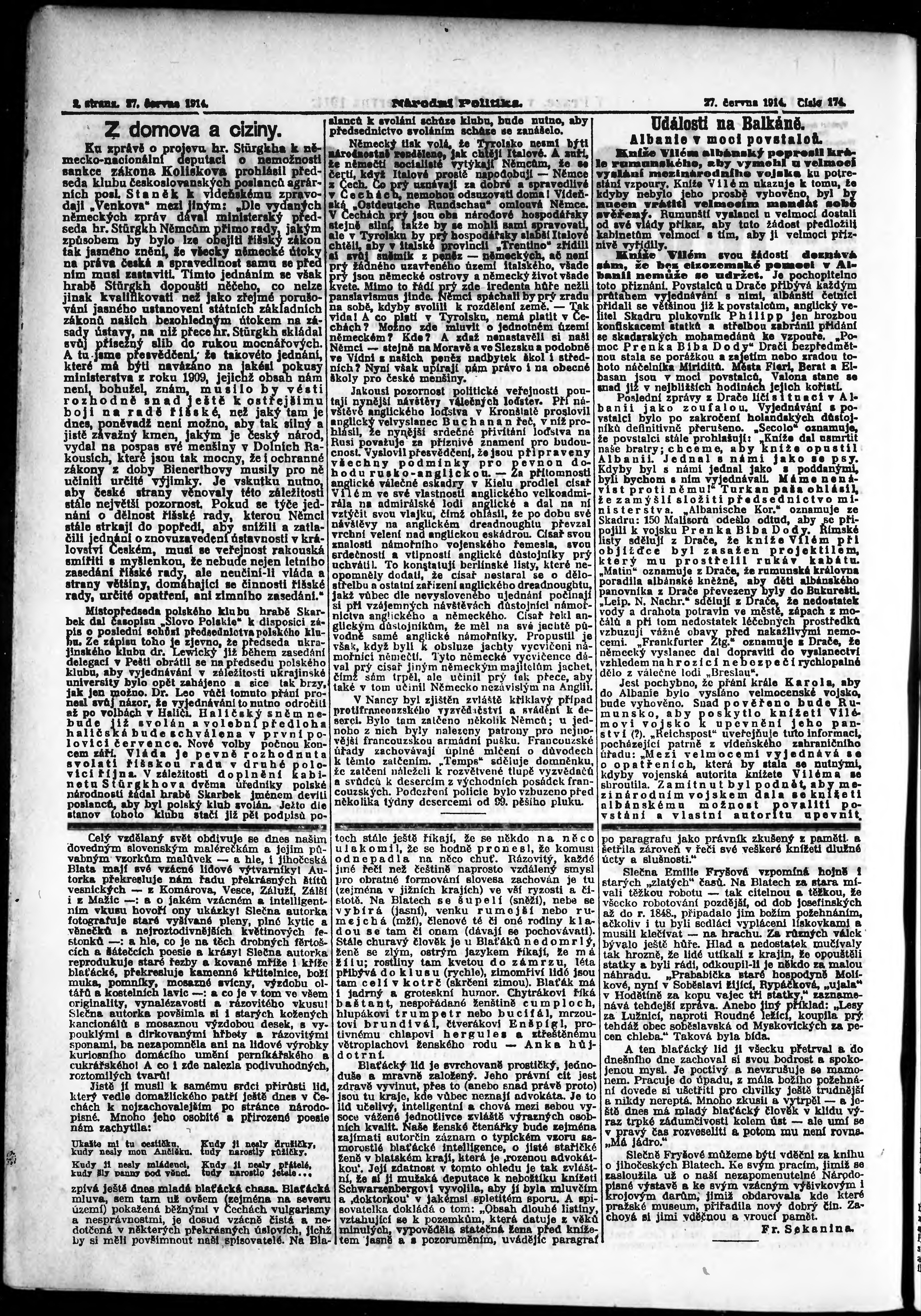 * Datum vydání výtisku: 27.6.1914 Číslo výtisku: 174 Poznámky k výtisku: ranní vydání;