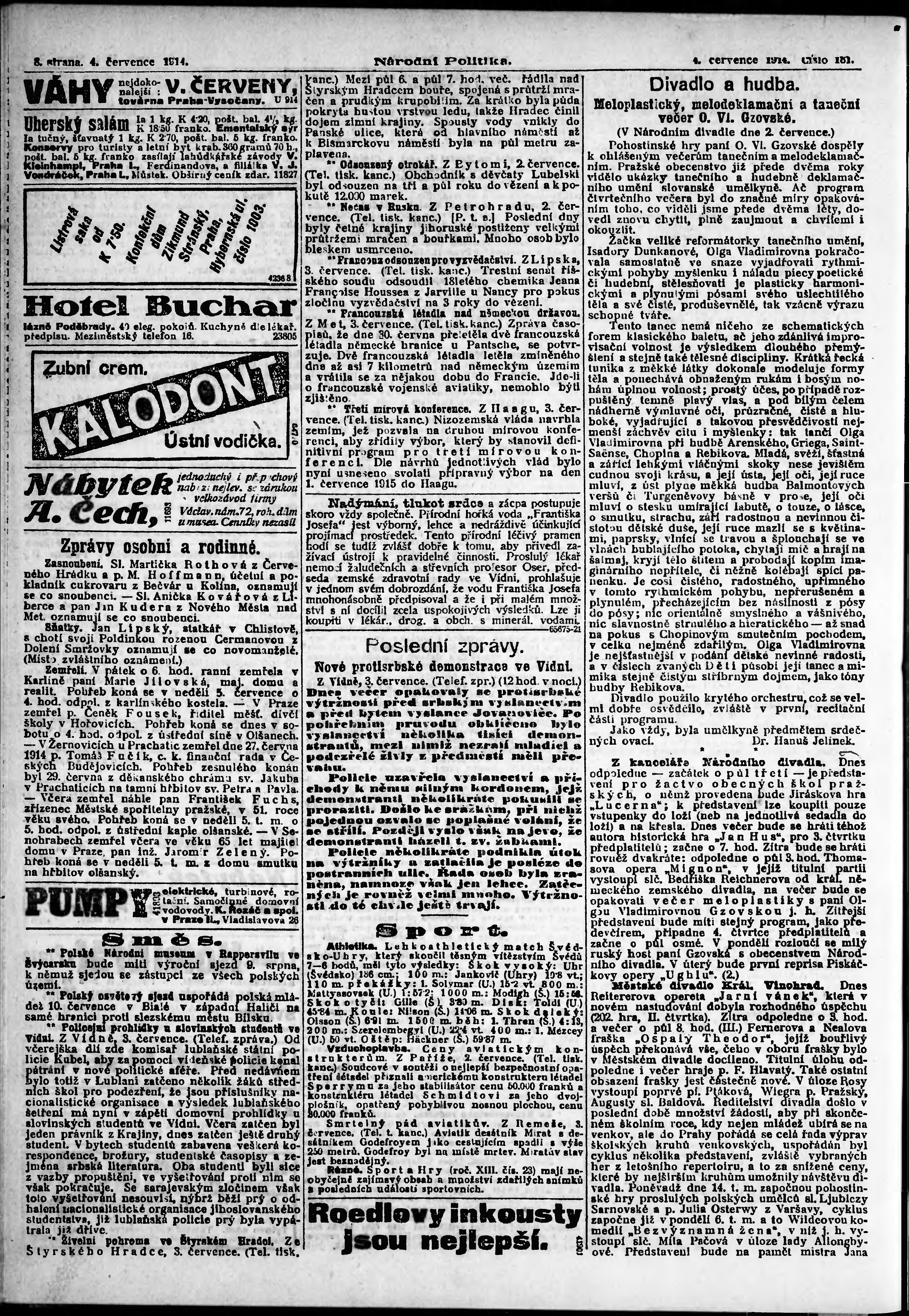 * Datum vydání výtisku: 4.7.1914 Číslo výtisku: 181 Poznámky k výtisku: ranní vydání; s. 9 - 10 není k dispozici;