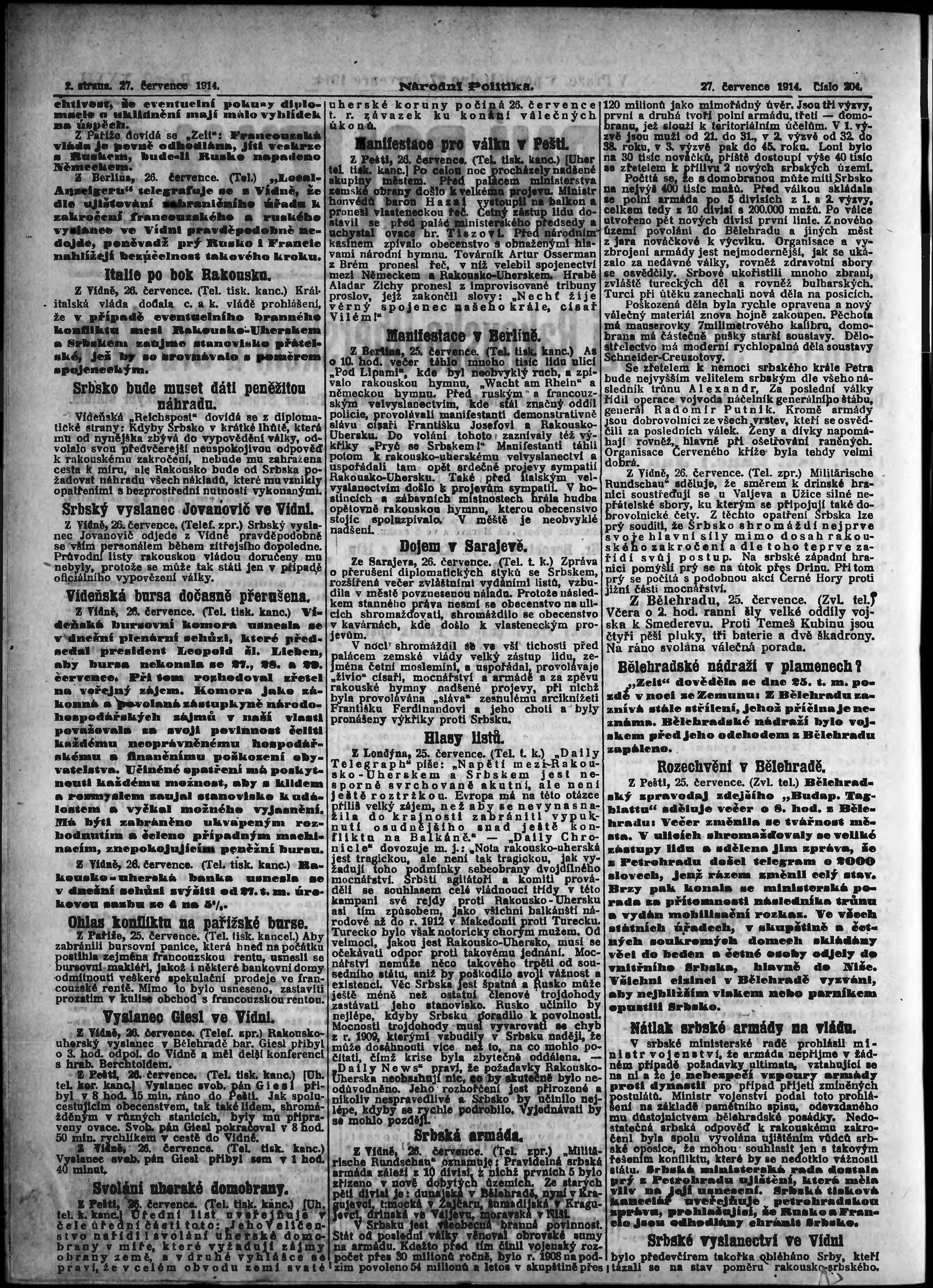* Datum vydání výtisku: 27.7.1914 Číslo výtisku: 204 Poznámky k výtisku: ranní vydání;