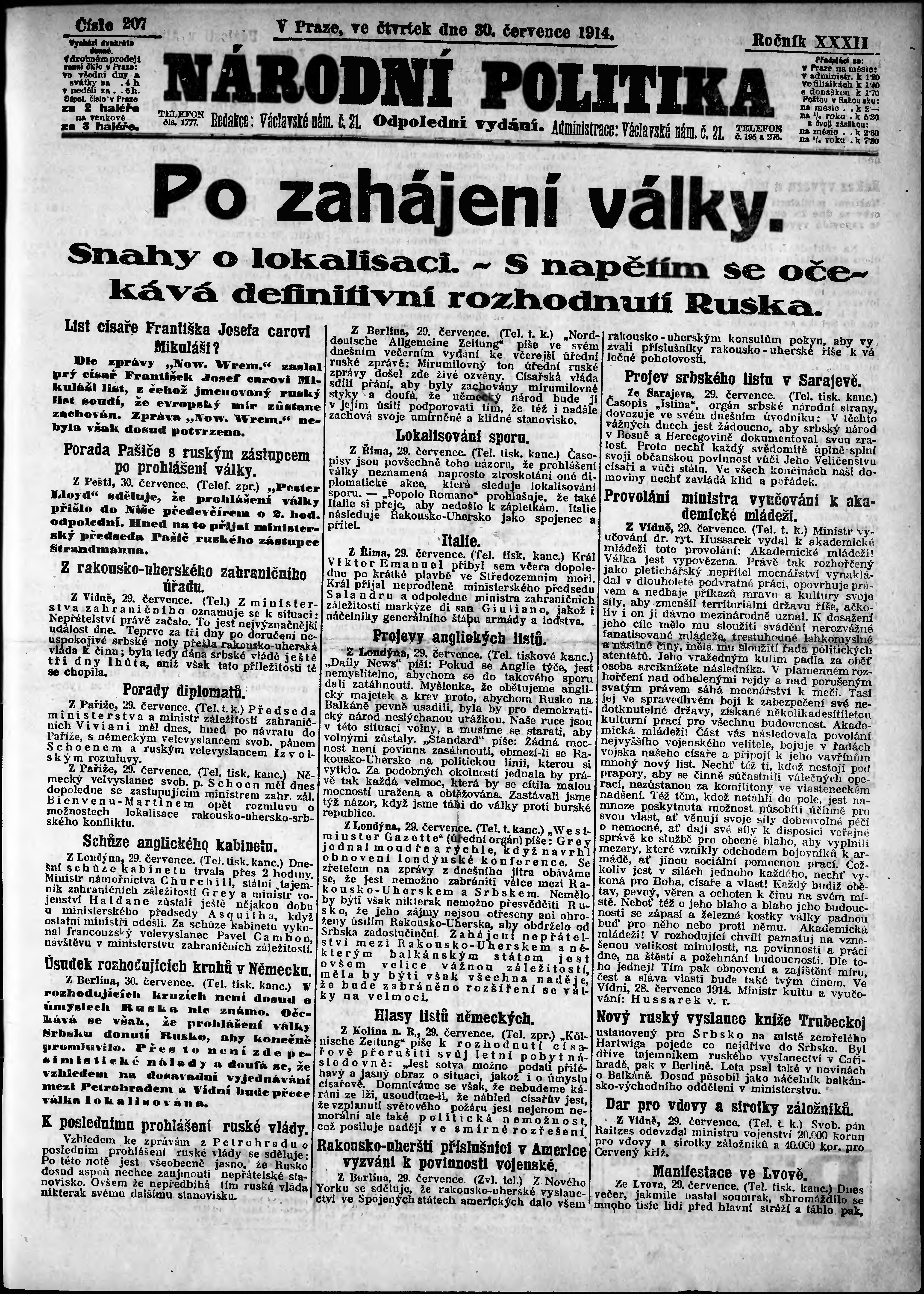 * Datum vydání výtisku: 30.7.1914 Číslo výtisku: 207 Poznámky k výtisku: odpolední vydání;