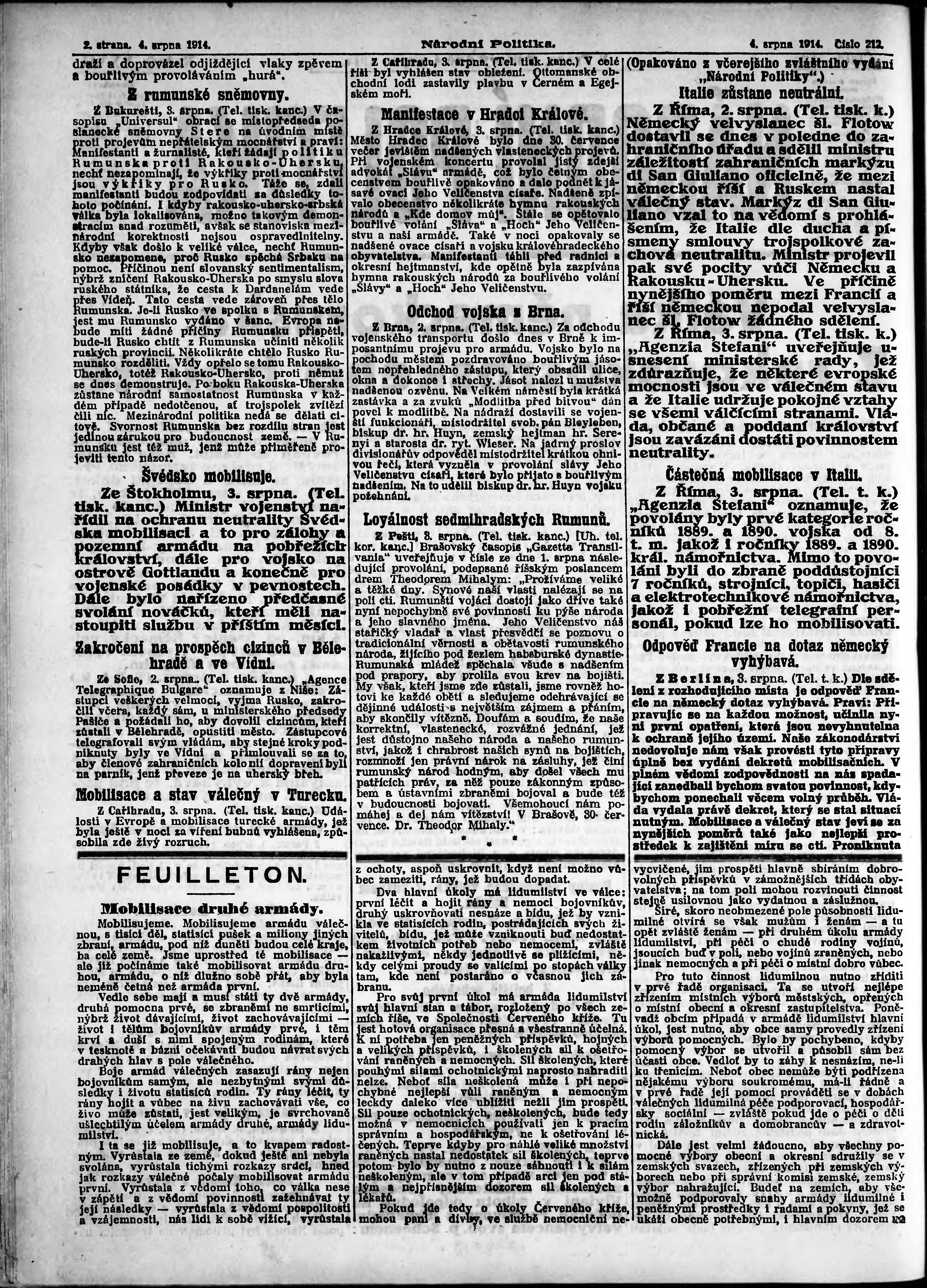 * Datum vydání výtisku: 4.8.1914 Číslo výtisku: 212 Poznámky k výtisku: ranní vydání;