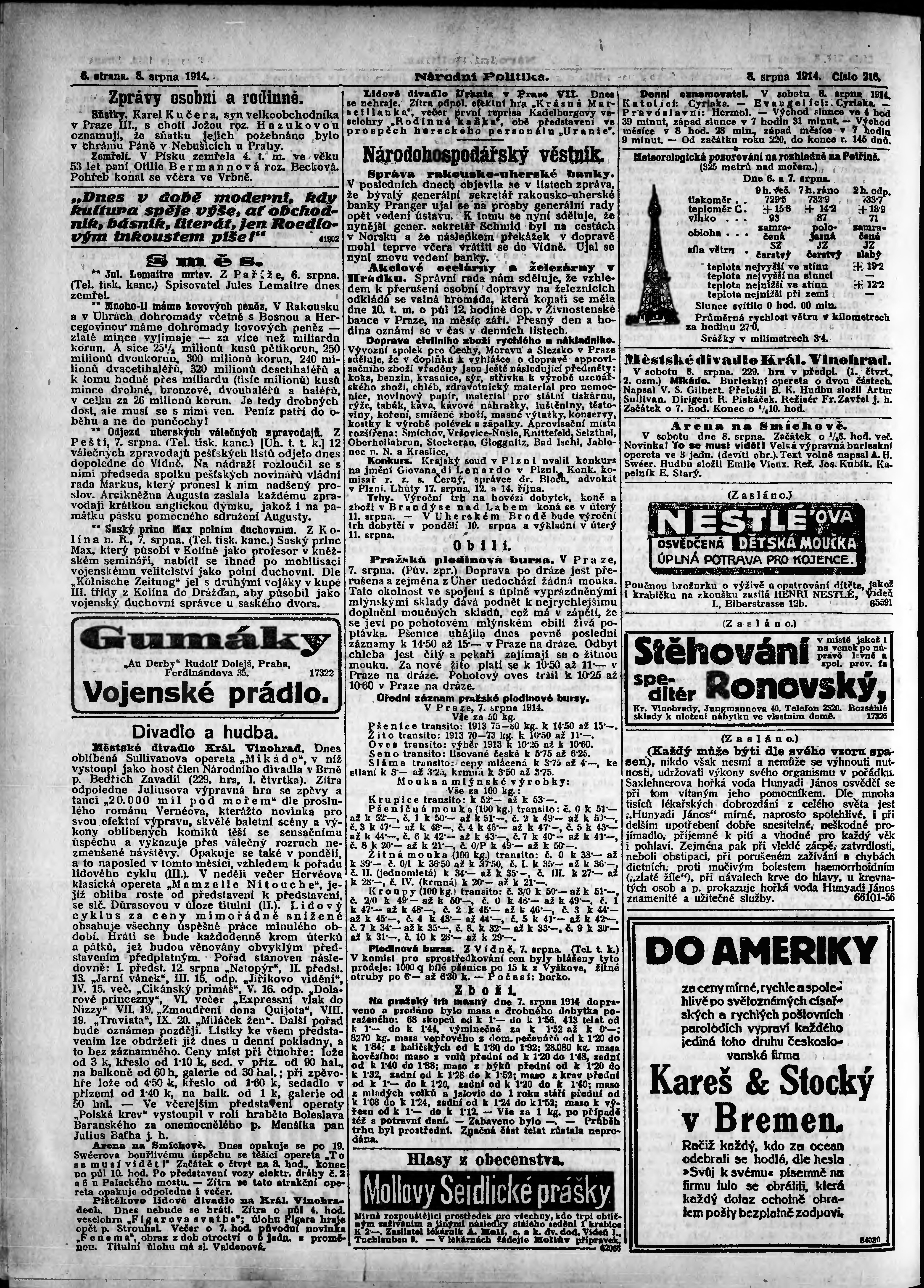 * Datum vydání výtisku: 8.8.1914 Číslo výtisku: 216 Poznámky k výtisku: ranní vydání;