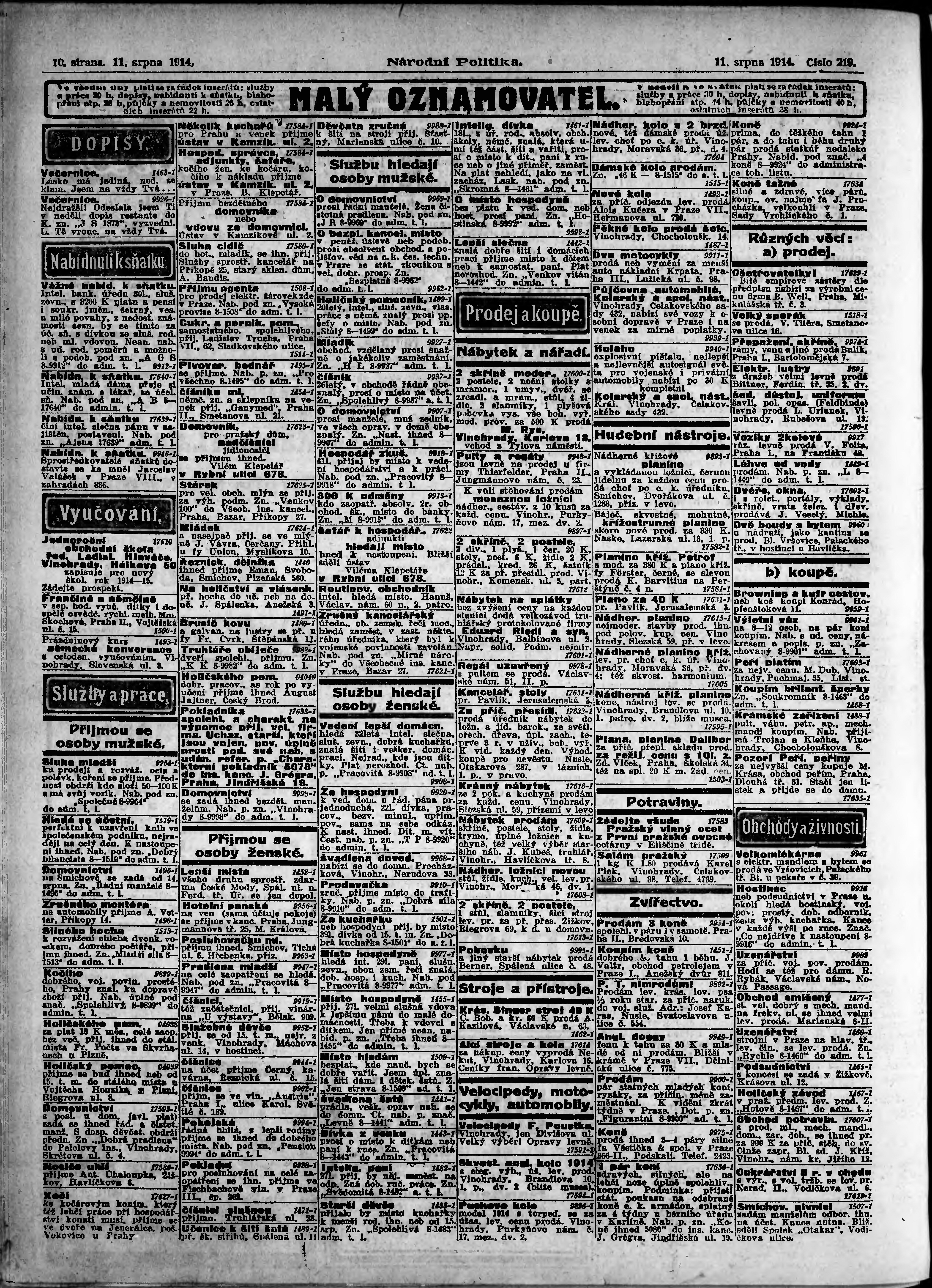 * Datum vydání výtisku: 11.8.1914 Číslo výtisku: 219 Poznámky k výtisku: ranní vydání; 2. vydání;