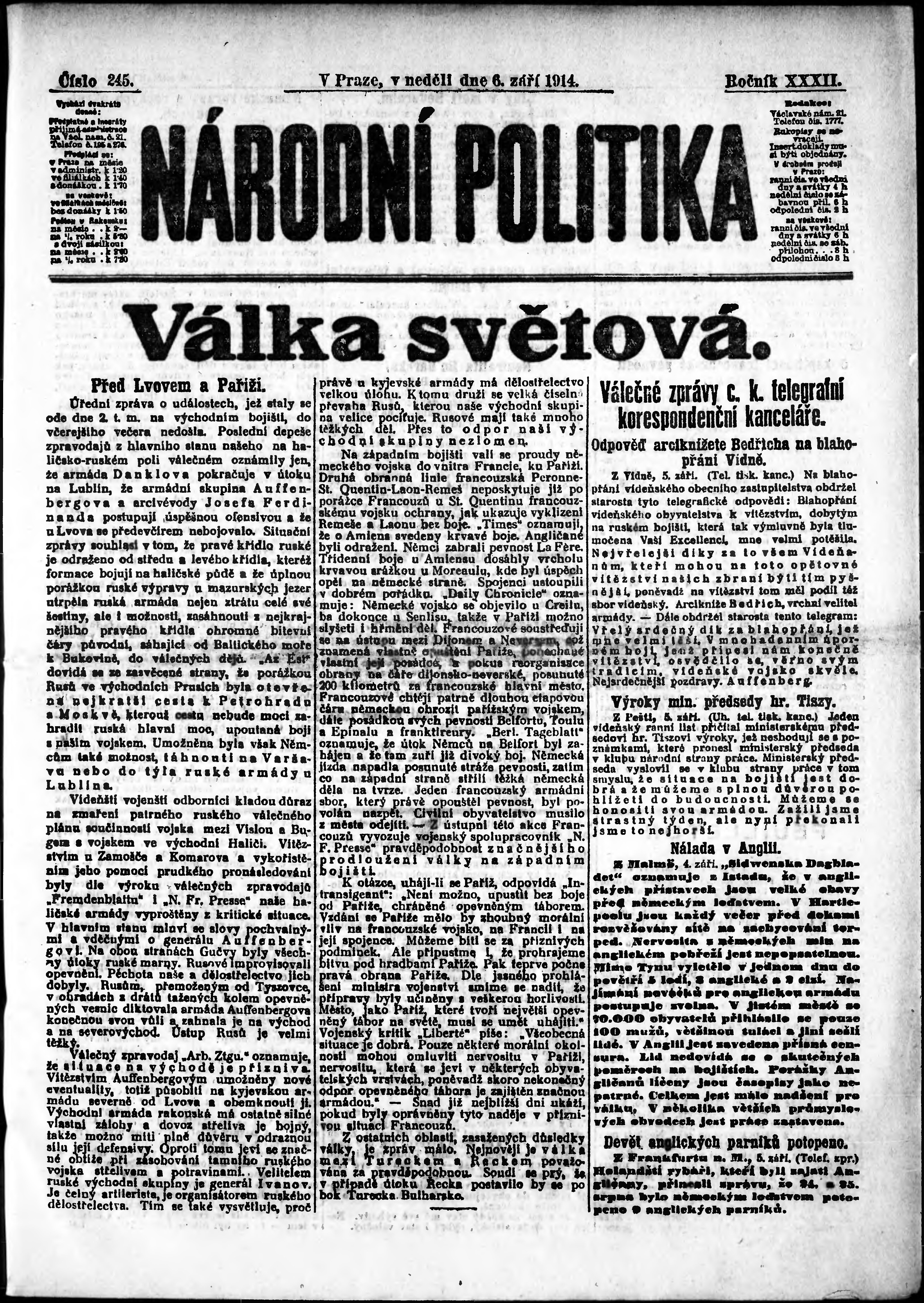 * Datum vydání výtisku: 6.9.1914 Číslo výtisku: 245 Poznámky k výtisku: ranní vydání;