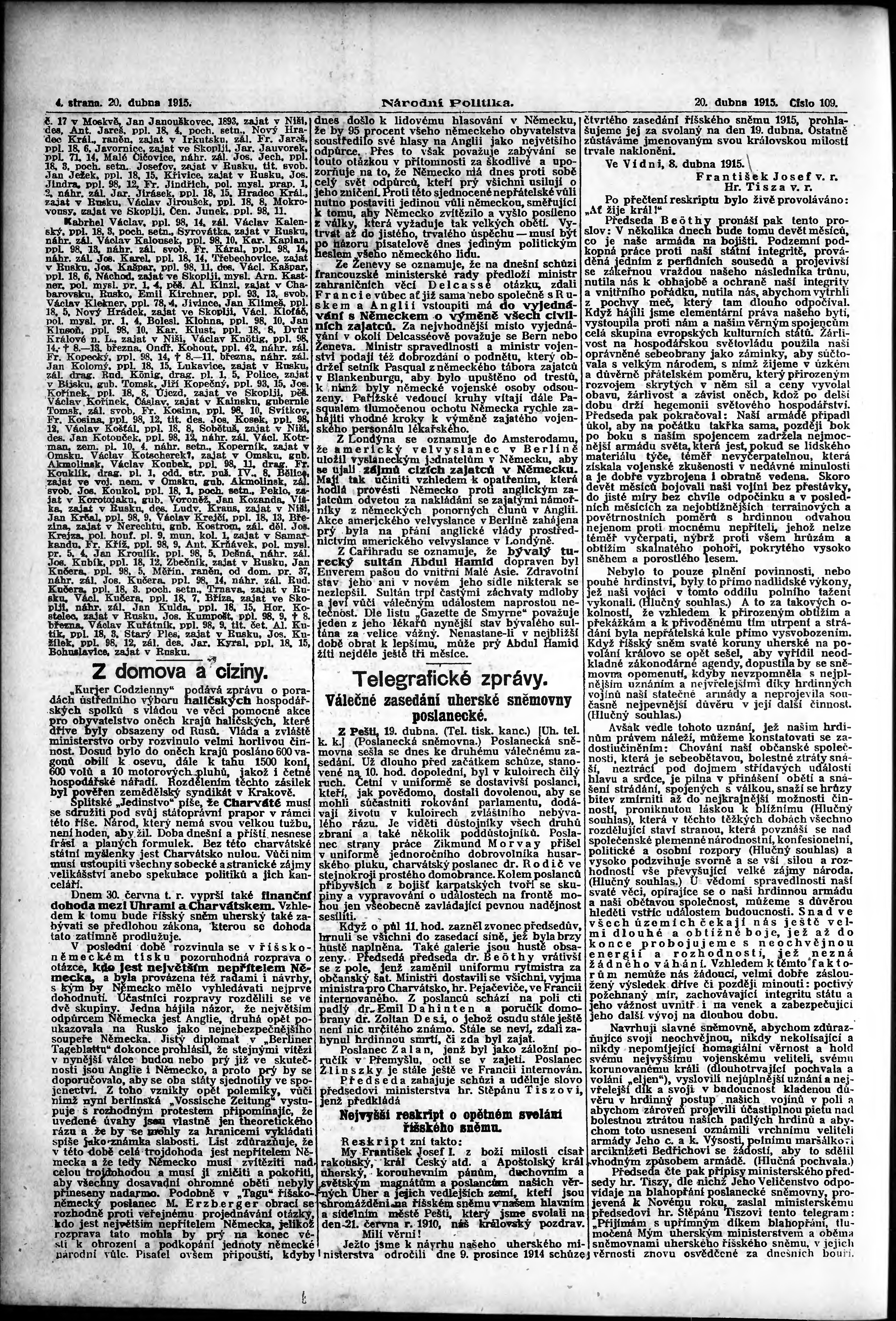 * Datum vydání výtisku: 20.4.1915 Číslo výtisku: 109 Poznámky k výtisku: ranní vydání; vydání pro Prahu;