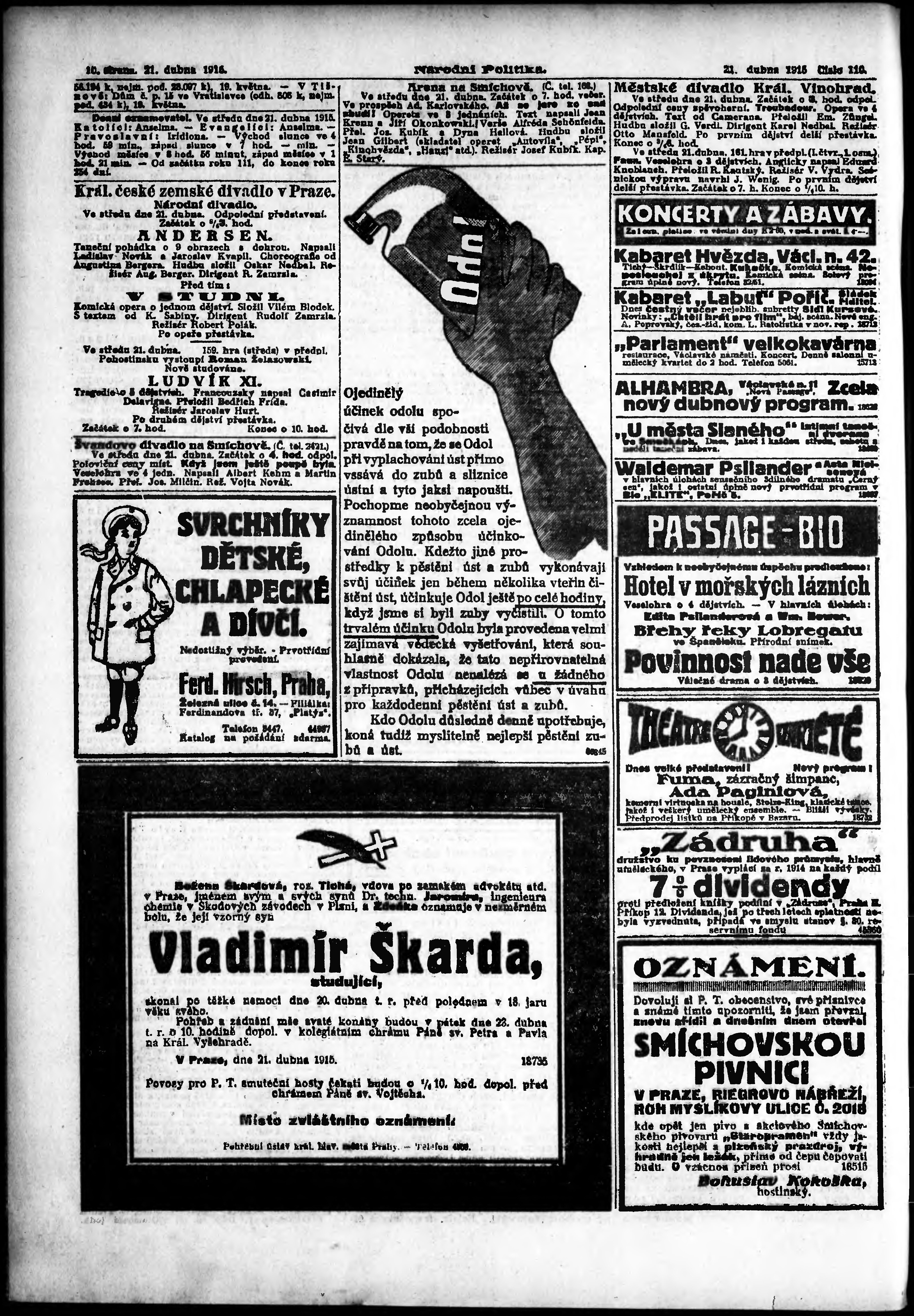 * Datum vydání výtisku: 21.4.1915 Číslo výtisku: 110 Poznámky k výtisku: ranní vydání; vydání pro Prahu;