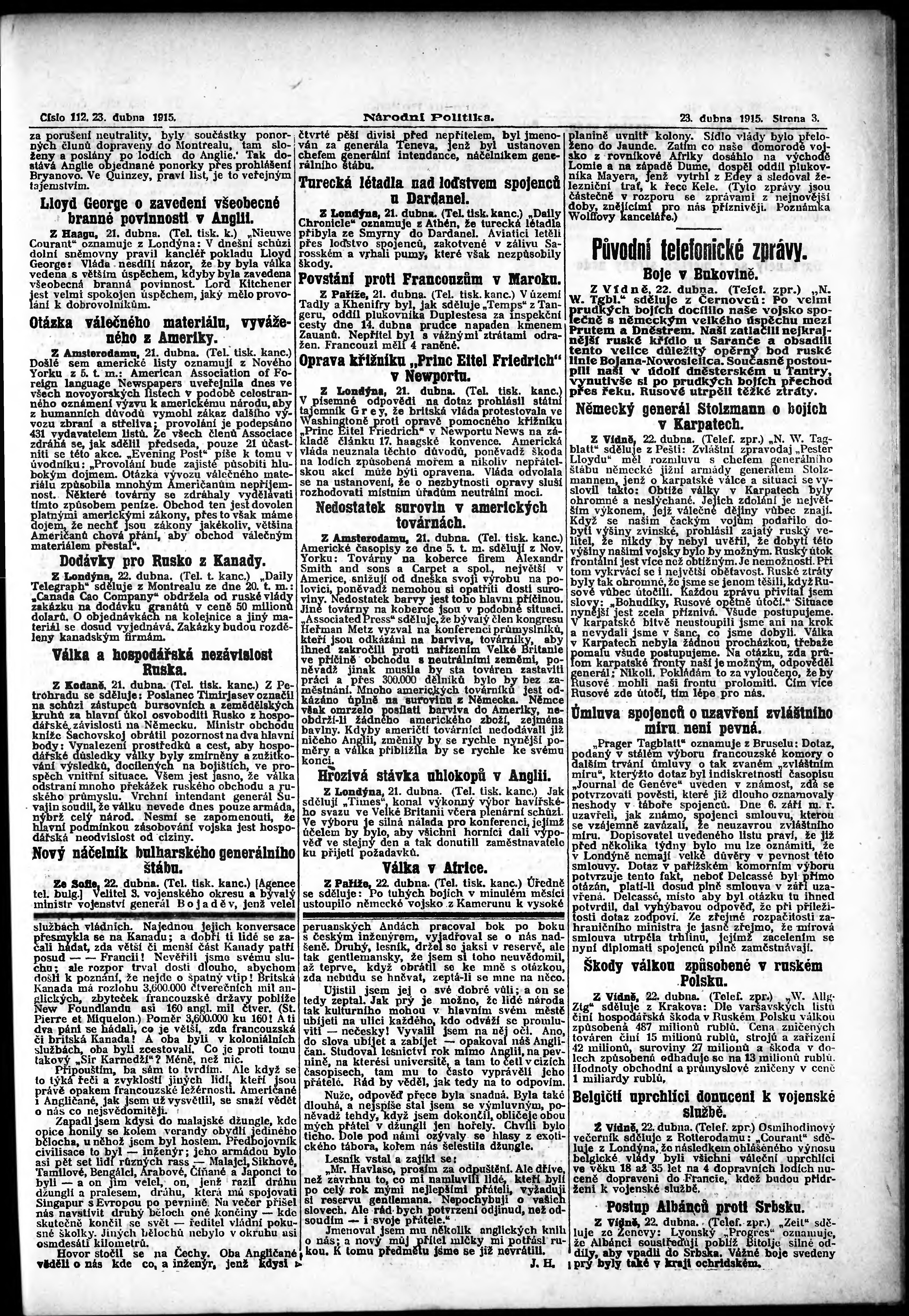 * Datum vydání výtisku: 23.4.1915 Číslo výtisku: 112 Poznámky k výtisku: ranní vydání; vydání pro Prahu;