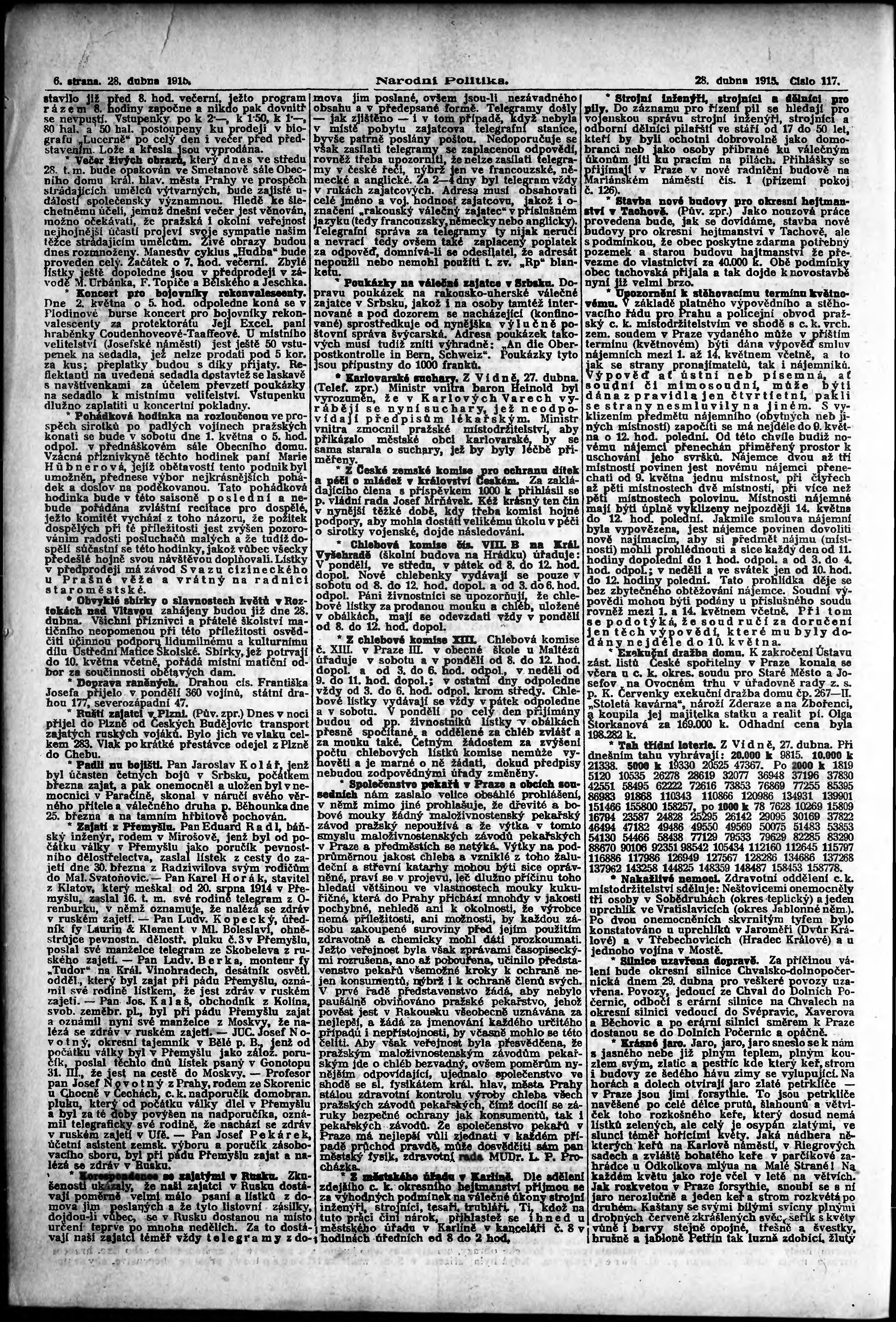 * Datum vydání výtisku: 28.4.1915 Číslo výtisku: 117 Poznámky k výtisku: ranní vydání; vydání pro Prahu;