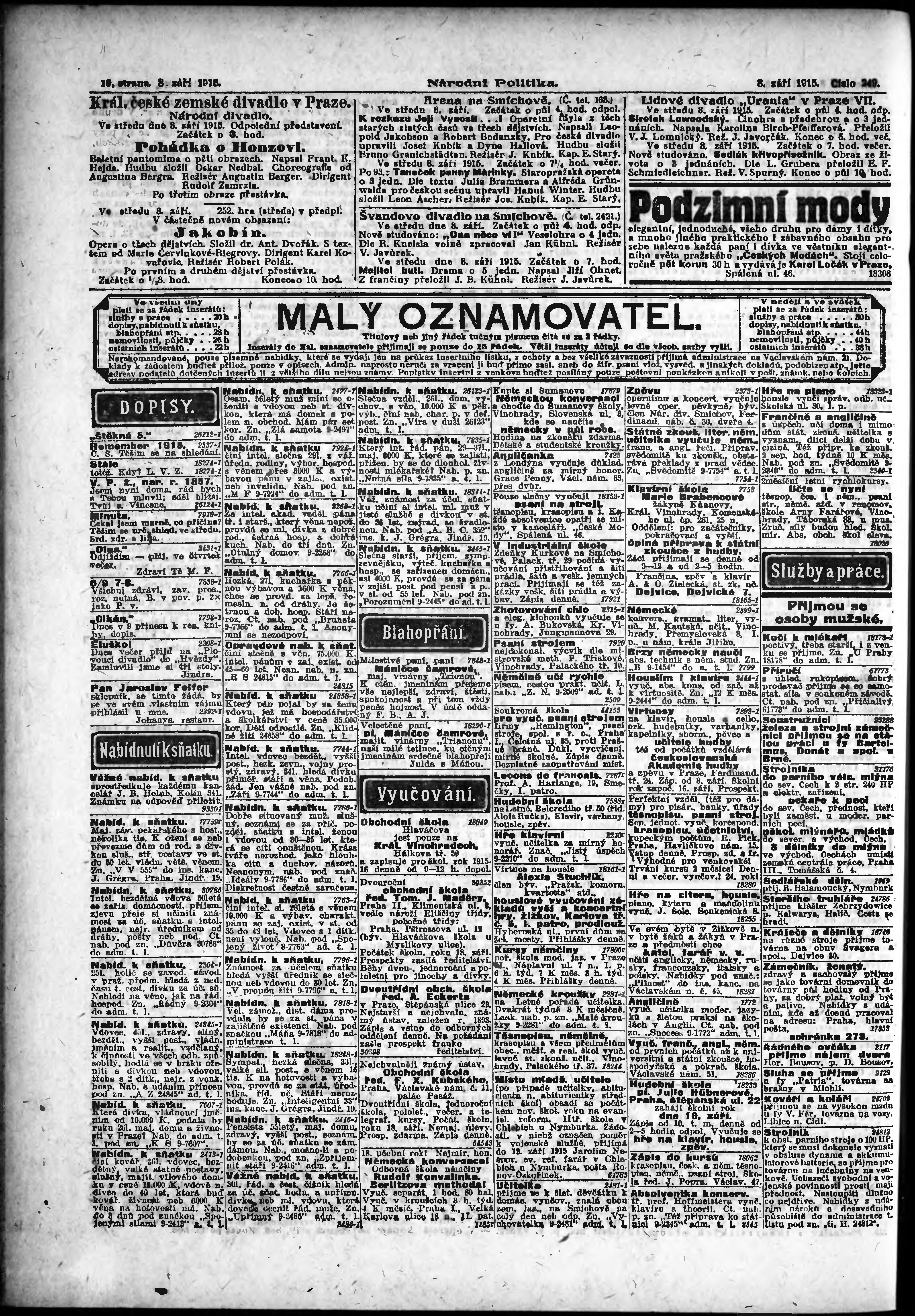 * Datum vydání výtisku: 8.9.1915 Číslo výtisku: 249 Poznámky k výtisku: ranní vydání;