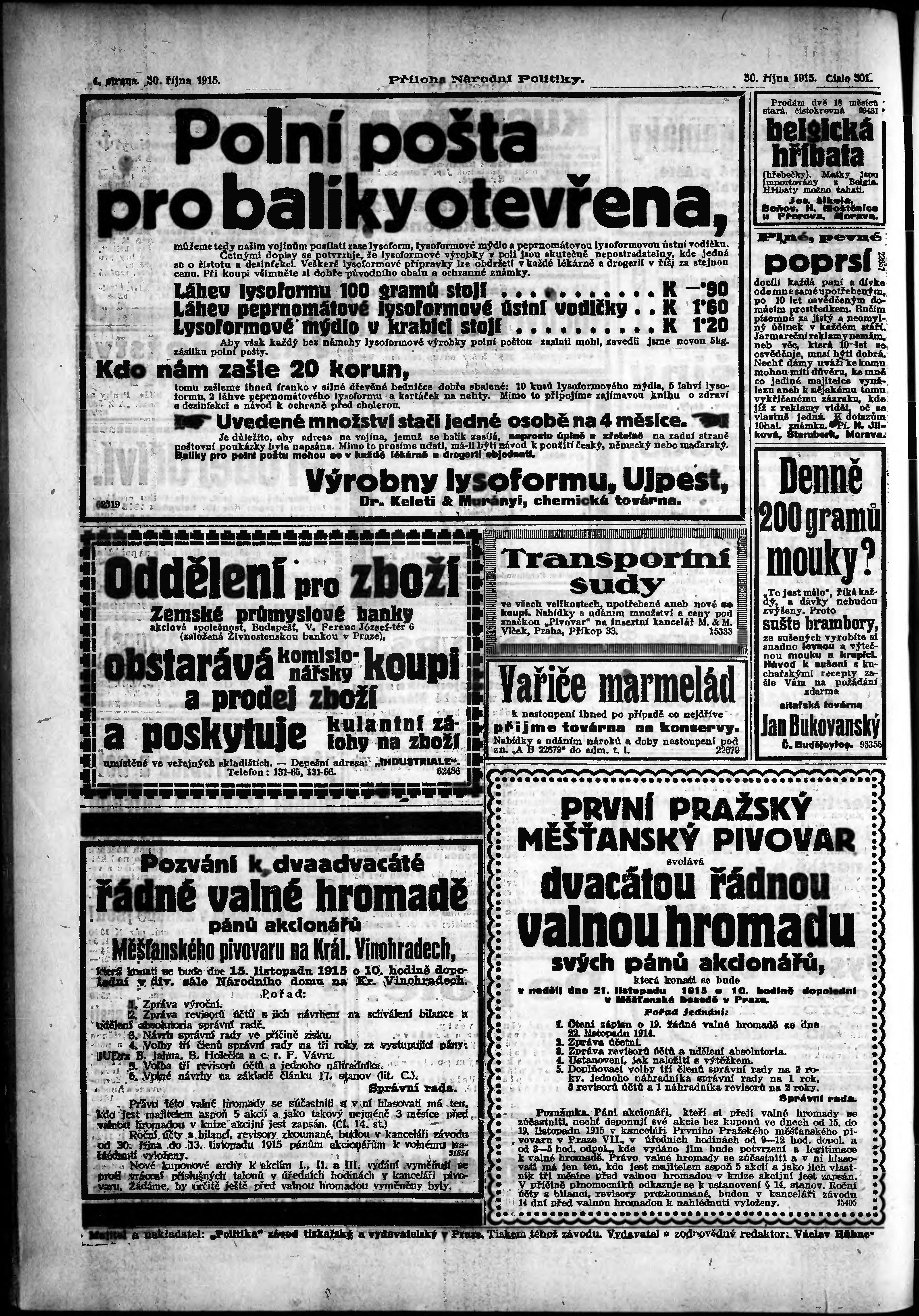 * Datum vydání výtisku: 30.10.1915 Číslo výtisku: 301 Typ výtisku: příloha