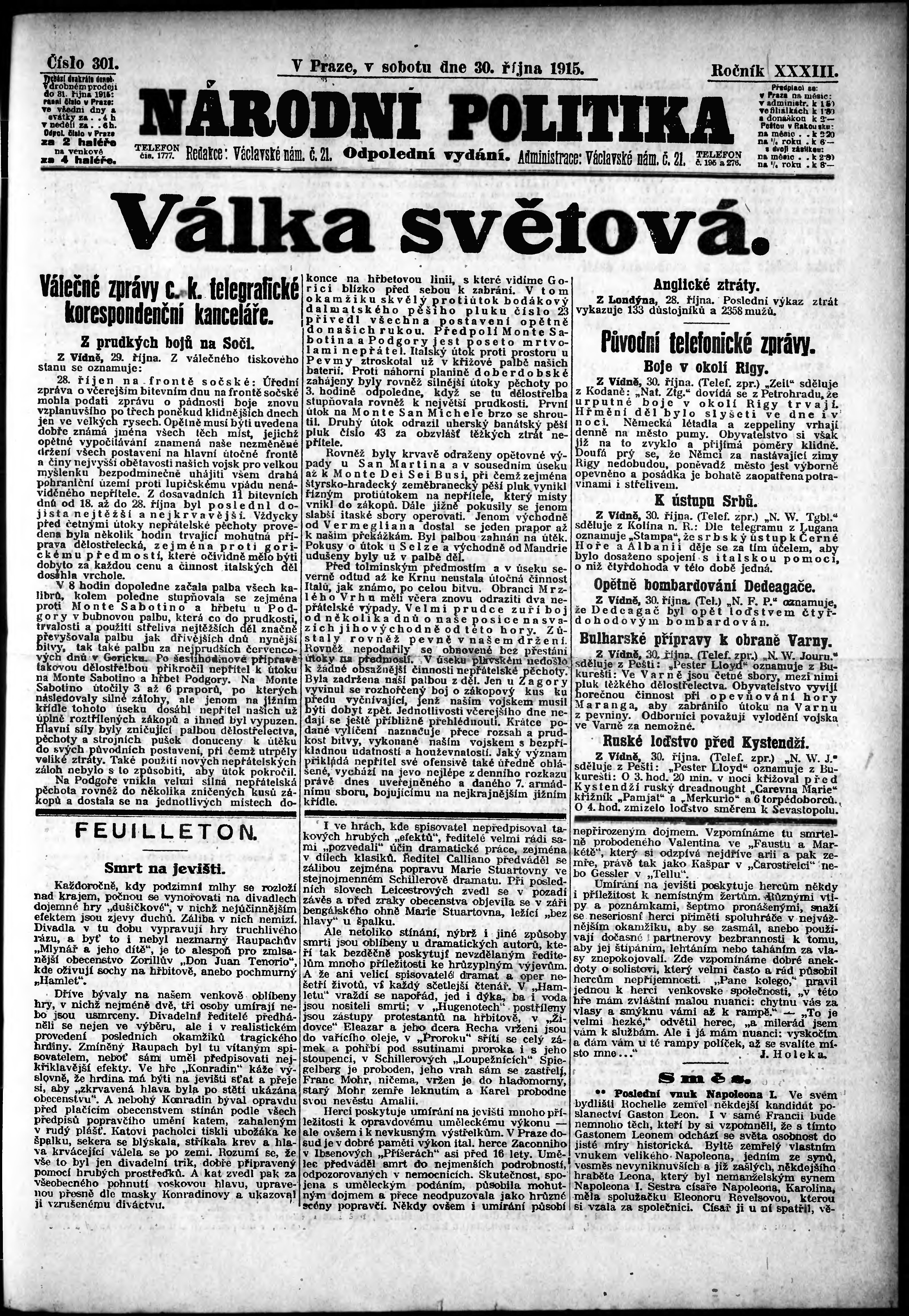 * Datum vydání výtisku: 30.10.1915 Číslo výtisku: 301 Poznámky k výtisku: odpolední vydání;