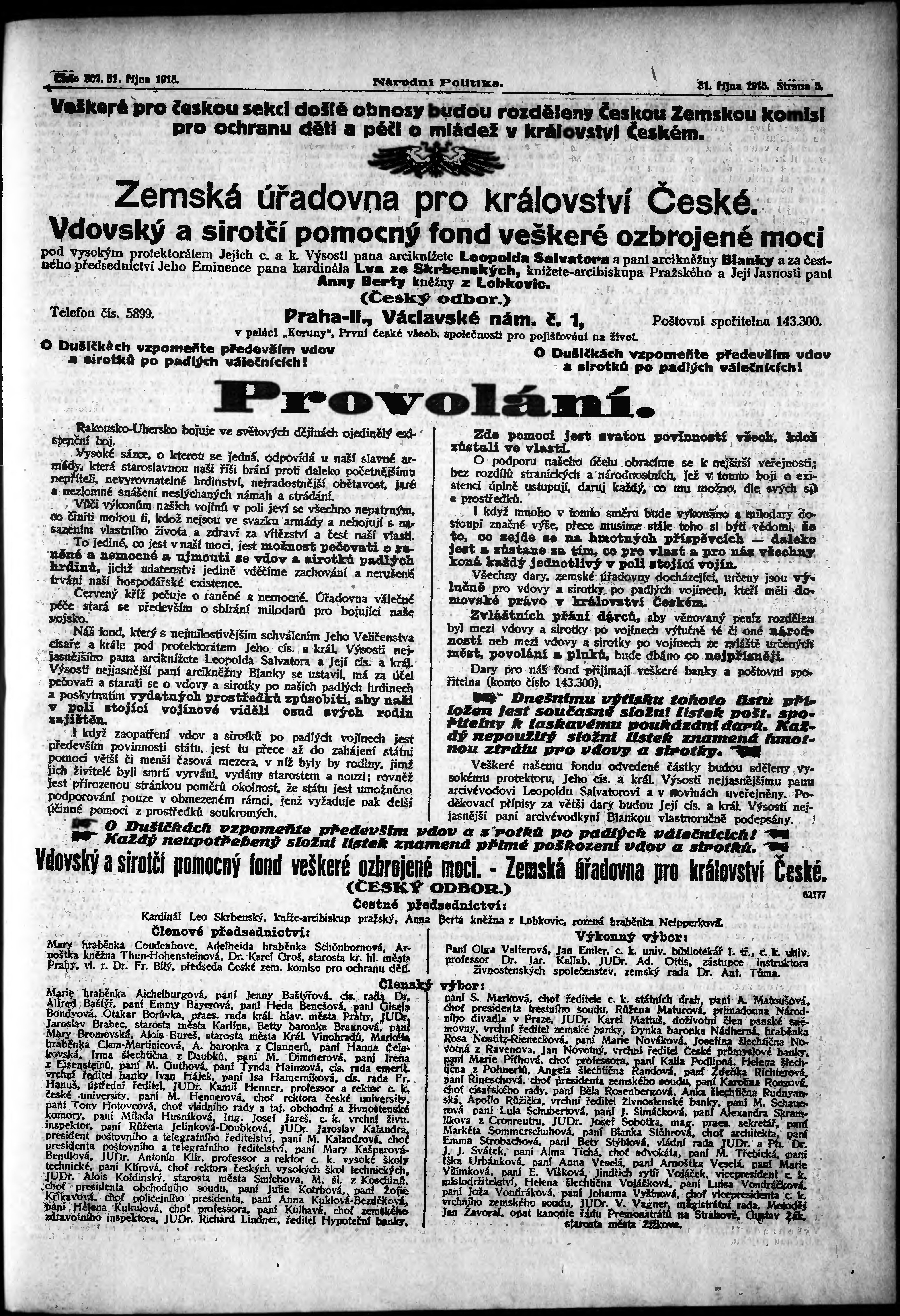 * Datum vydání výtisku: 31.10.1915 Číslo výtisku: 302 Poznámky k výtisku: ranní vydání;