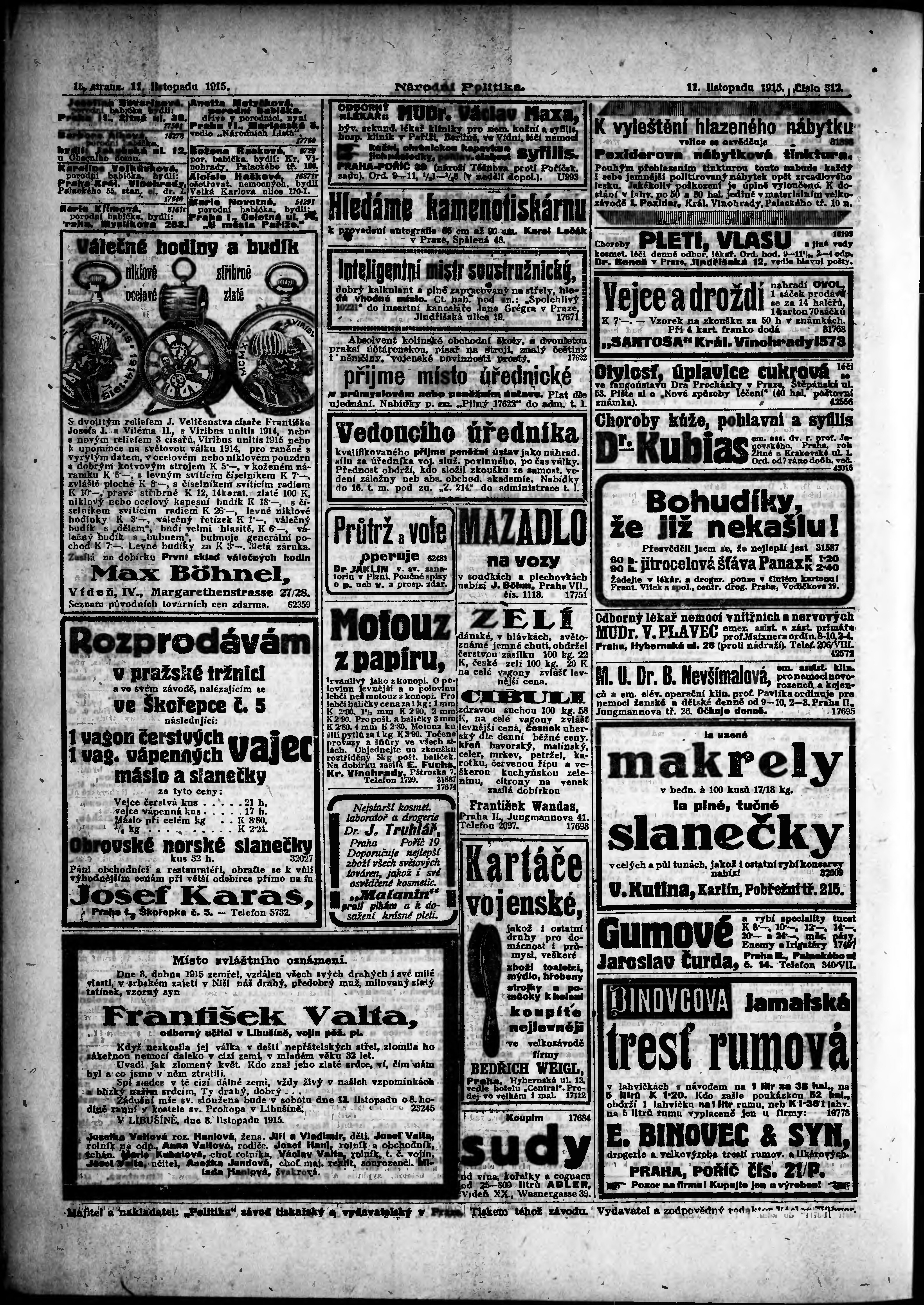 * Datum vydání výtisku: 11.11.1915 Číslo výtisku: 312 Poznámky k výtisku: ranní vydání;