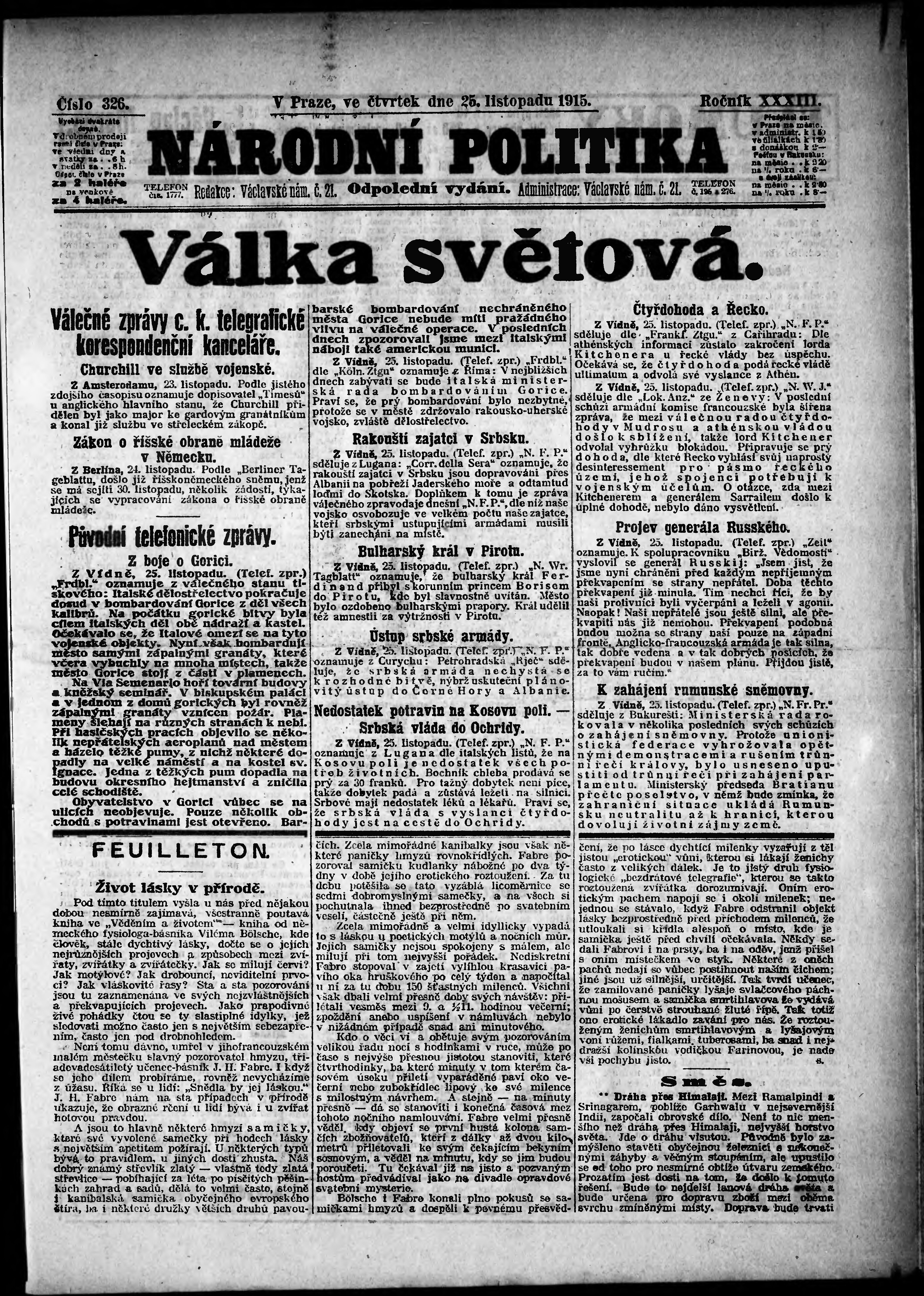 * Datum vydání výtisku: 25.11.1915 Číslo výtisku: 326 Poznámky k výtisku: odpolední vydání;