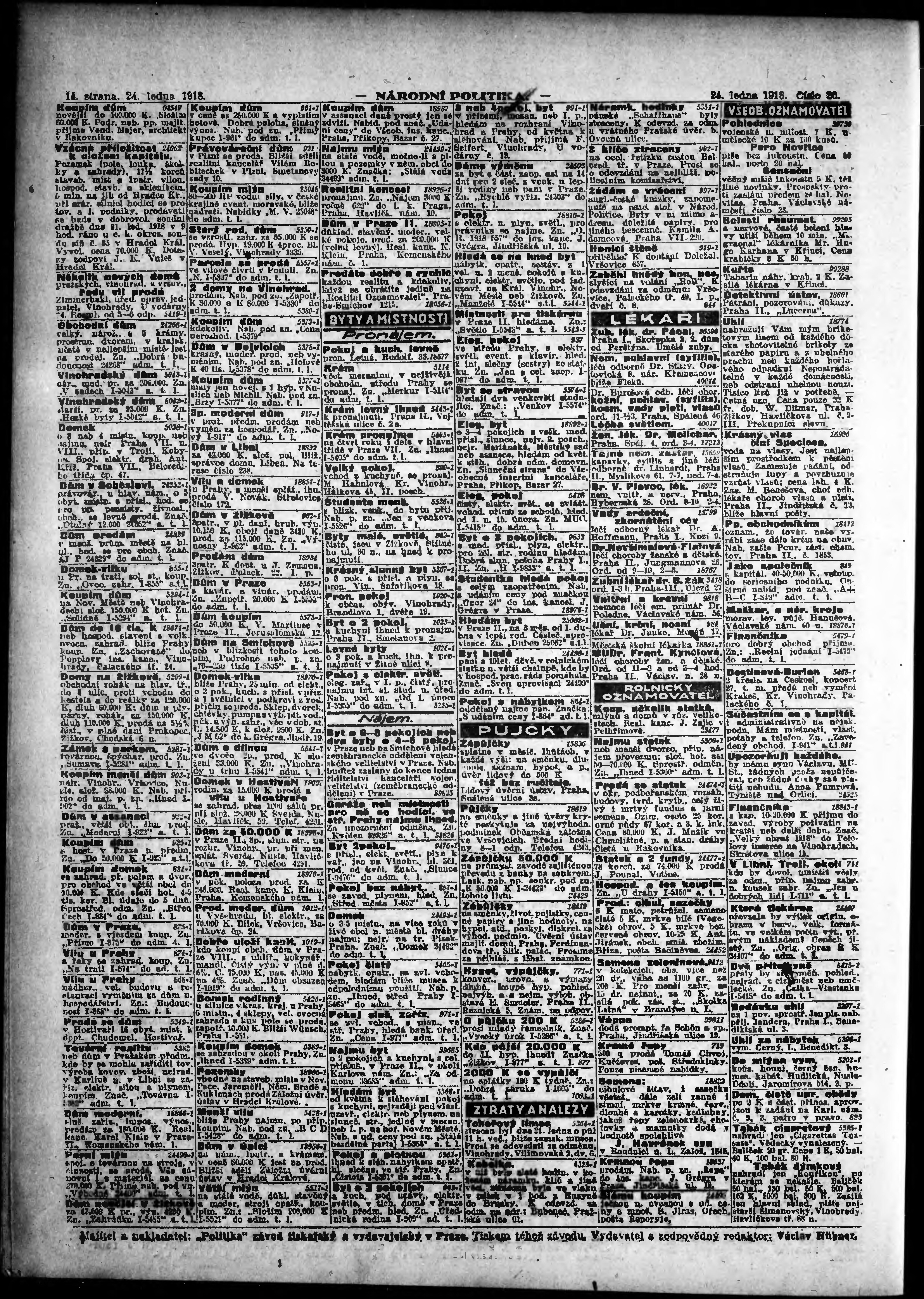* Datum vydání výtisku: 24.1.1918 Číslo výtisku: 20 Poznámky k výtisku: ranní vydání; vydání pro Prahu;