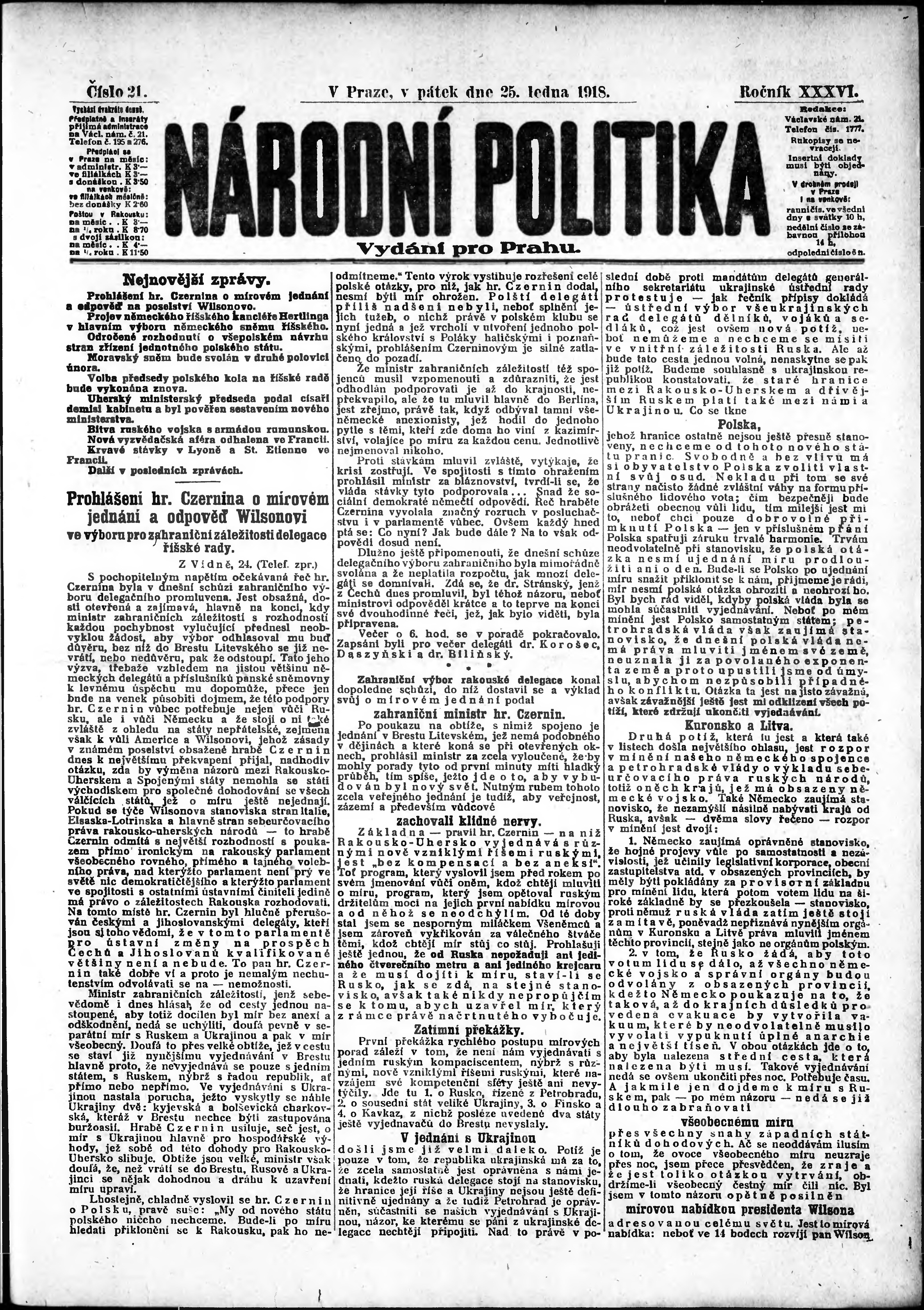 * Datum vydání výtisku: 25.1.1918 Číslo výtisku: 21 Poznámky k výtisku: ranní vydání; vydání pro Prahu;