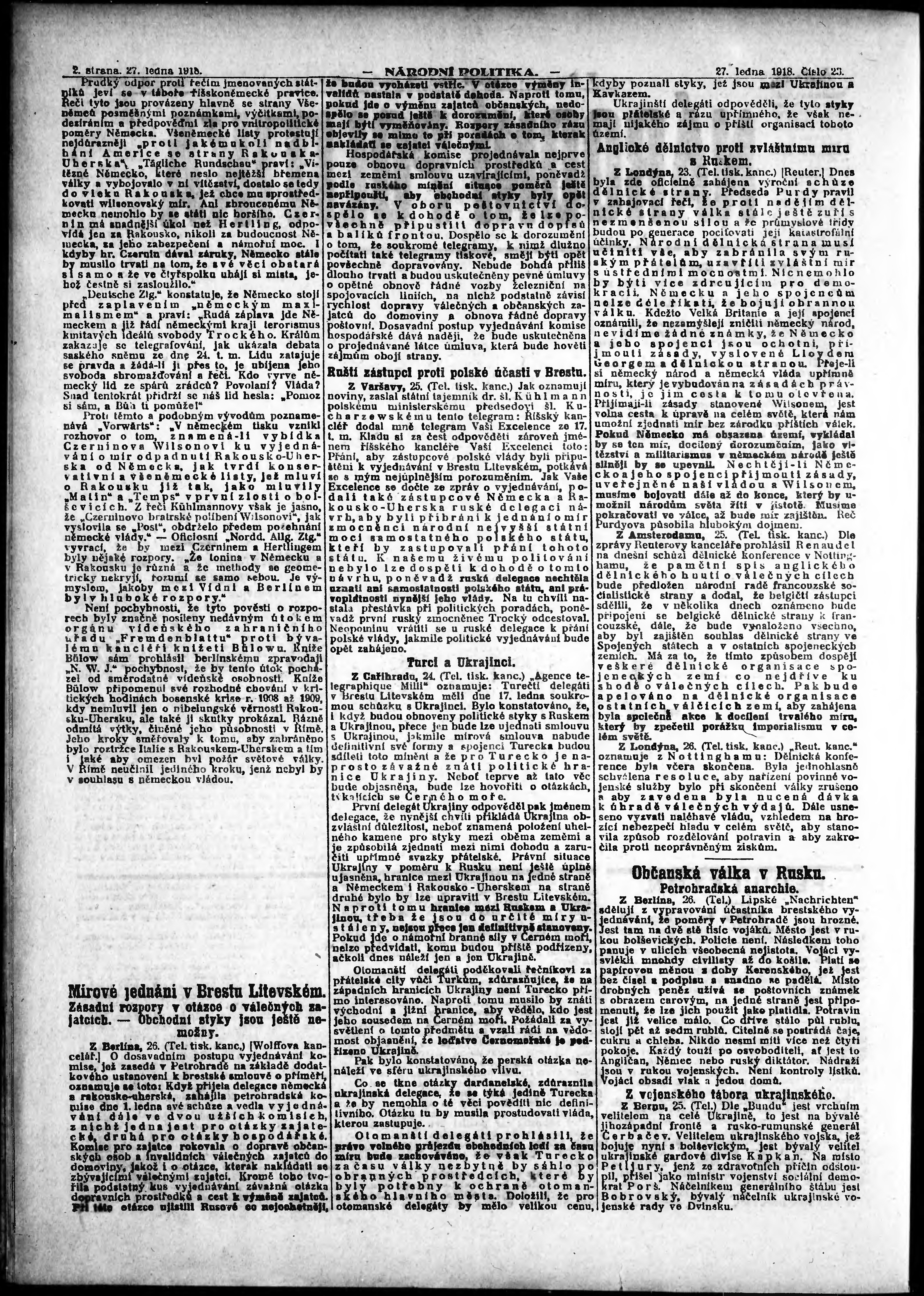 * Datum vydání výtisku: 27.1.1918 Číslo výtisku: 23 Poznámky k výtisku: ranní vydání;