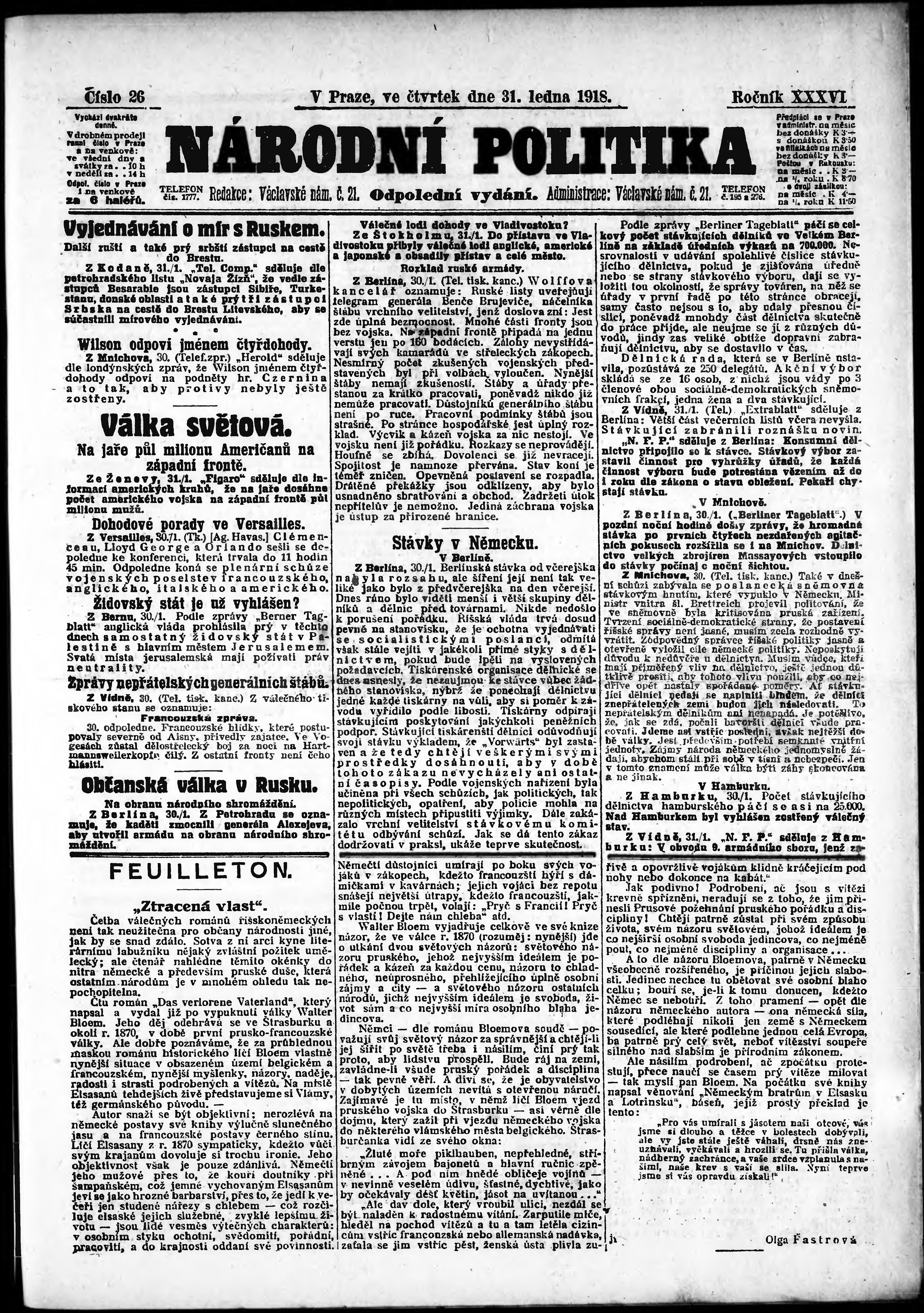 * Datum vydání výtisku: 31.1.1918 Číslo výtisku: 26 Poznámky k výtisku: odpolední vydání;
