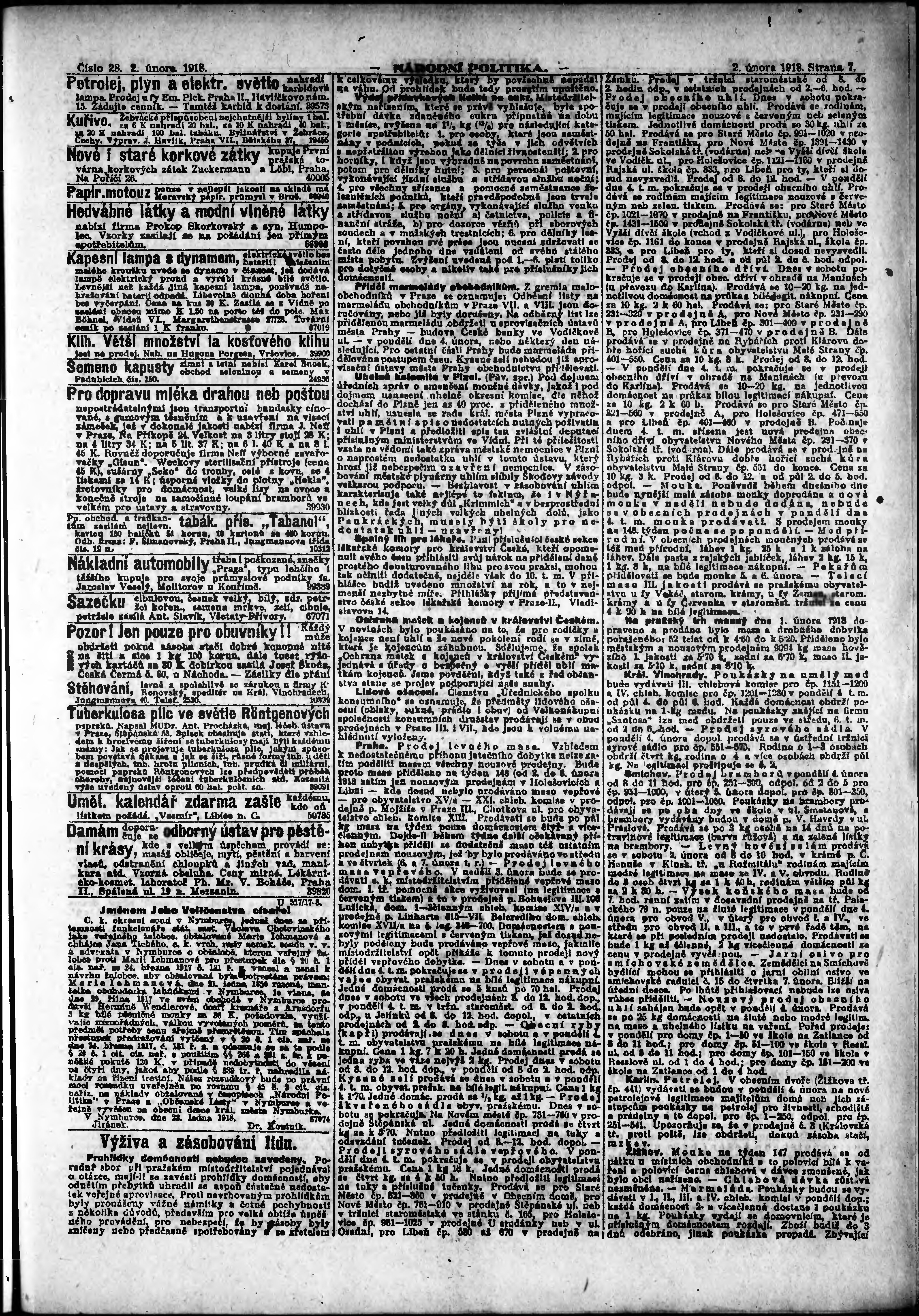 * Datum vydání výtisku: 2.2.1918 Číslo výtisku: 28 Poznámky k výtisku: ranní vydání;