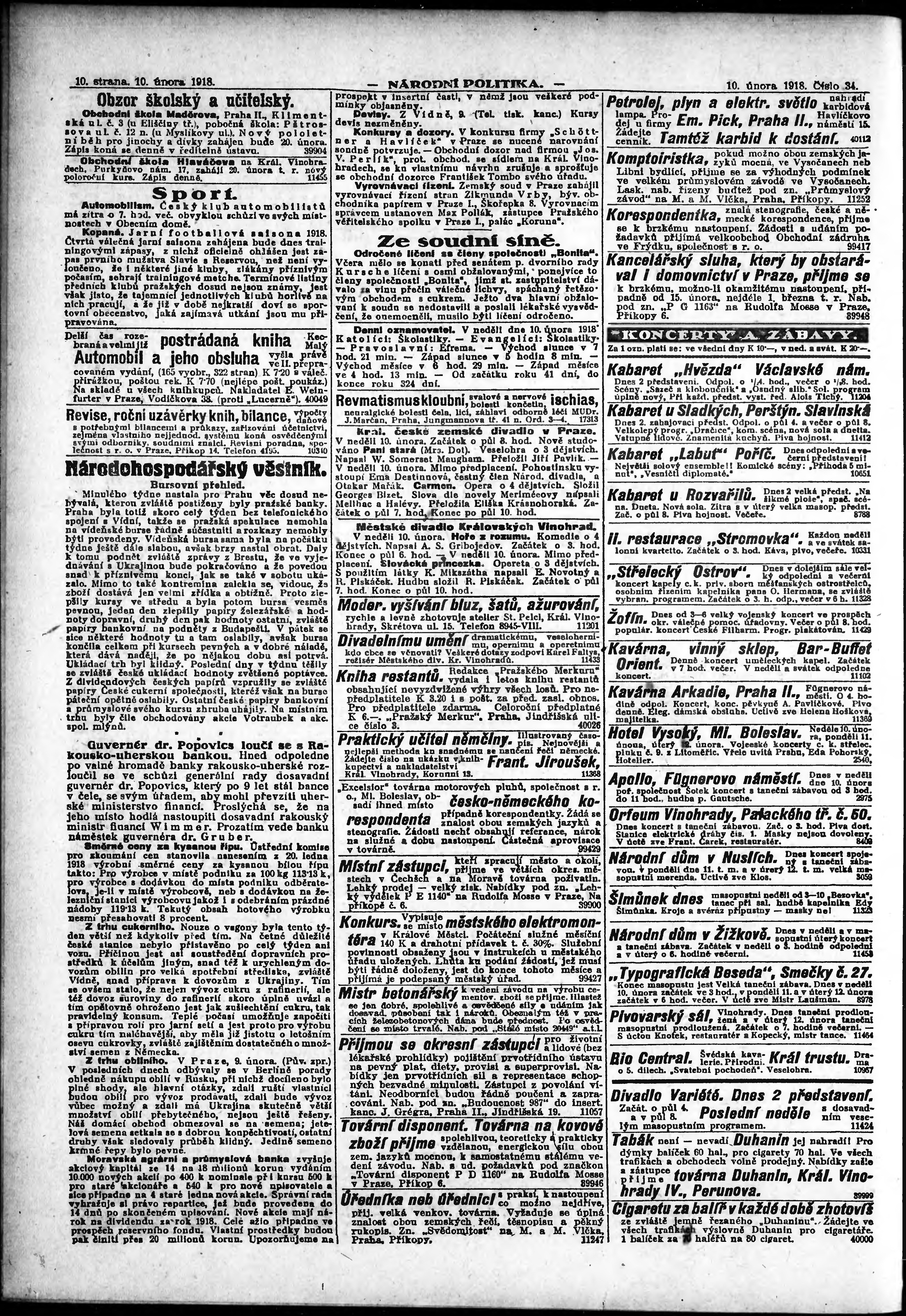 * Datum vydání výtisku: 10.2.1918 Číslo výtisku: 34 Poznámky k výtisku: ranní vydání;