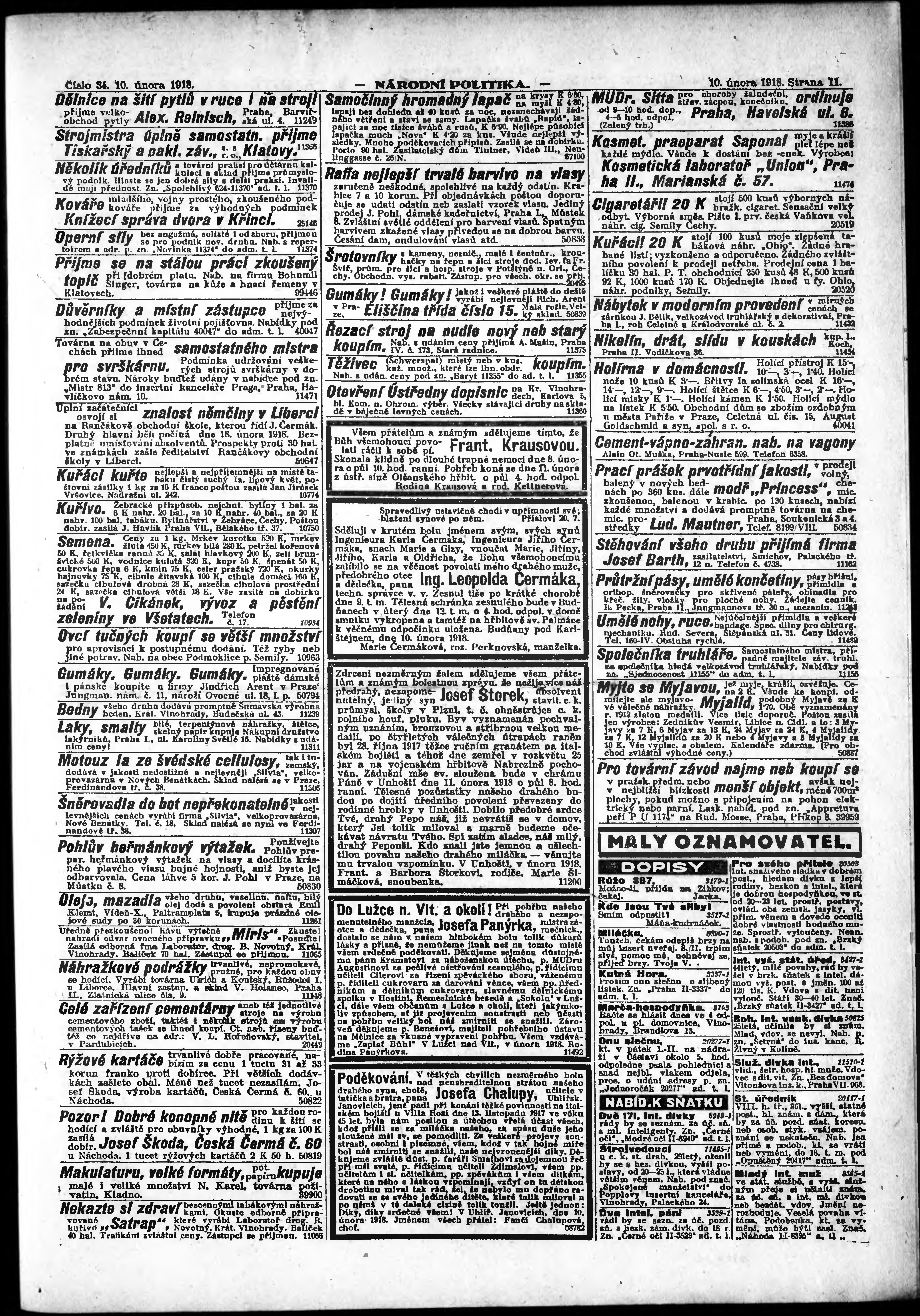 * Datum vydání výtisku: 10.2.1918 Číslo výtisku: 34 Poznámky k výtisku: ranní vydání;