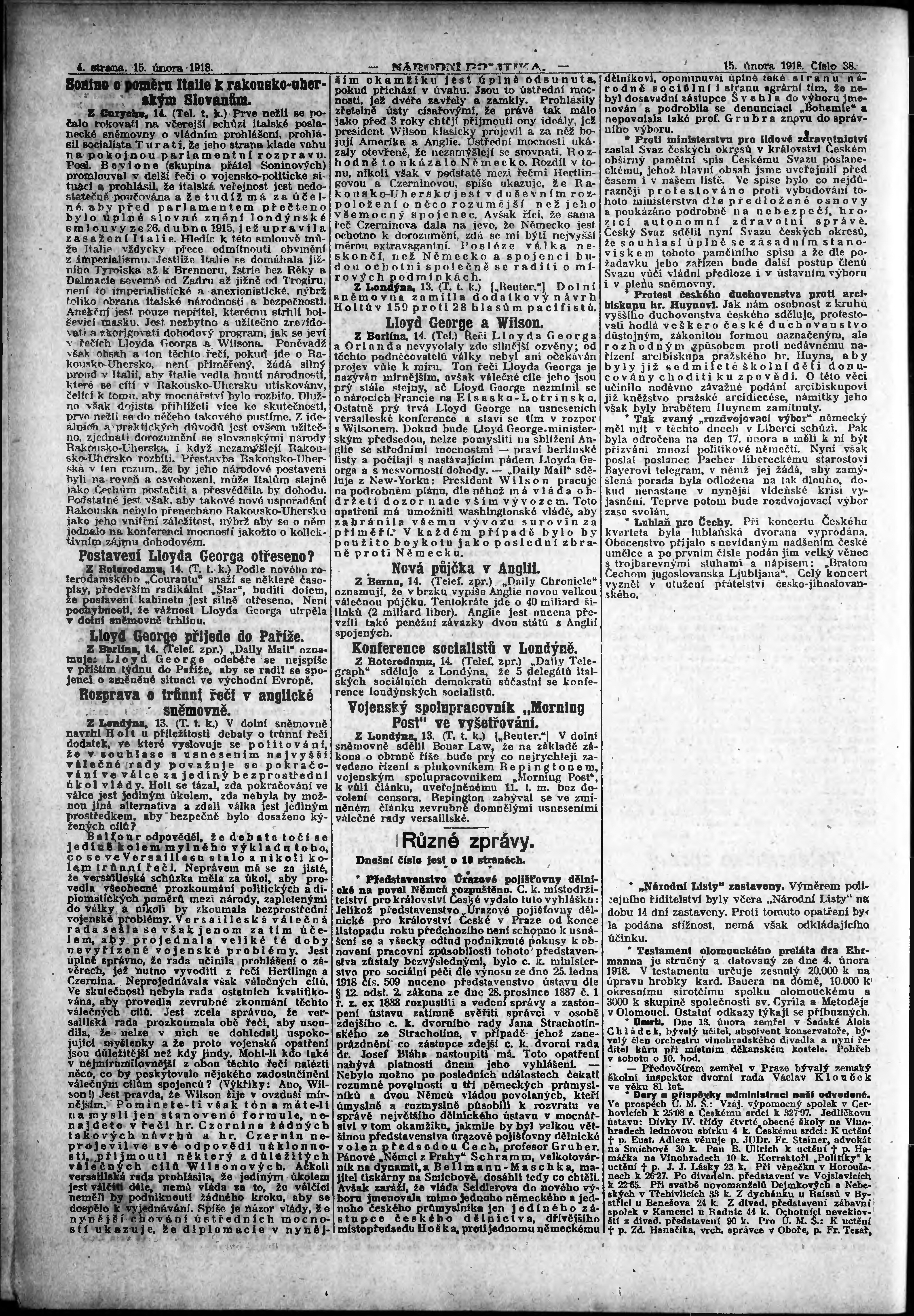 * Datum vydání výtisku: 15.2.1918 Číslo výtisku: 38 Poznámky k výtisku: ranní vydání; vydání pro Prahu;